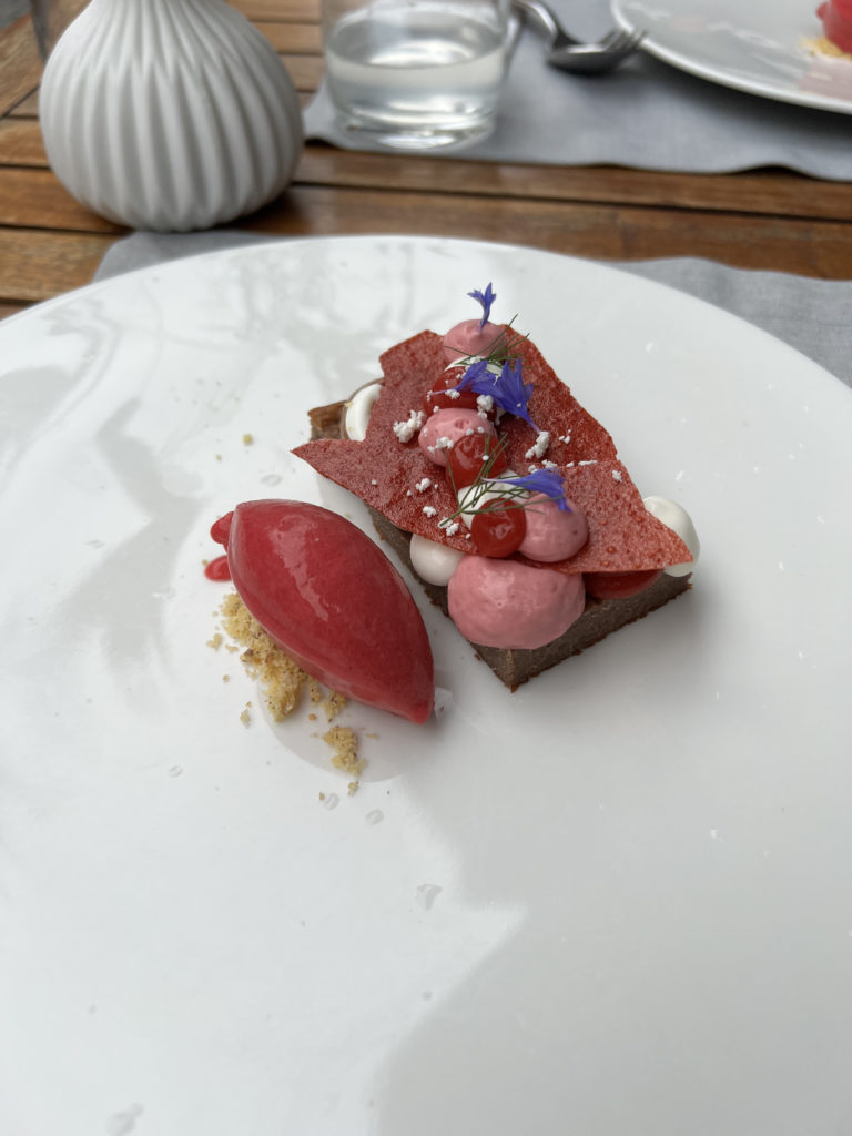 Milchschokoladentarte (Himbeermousse & -Eis)