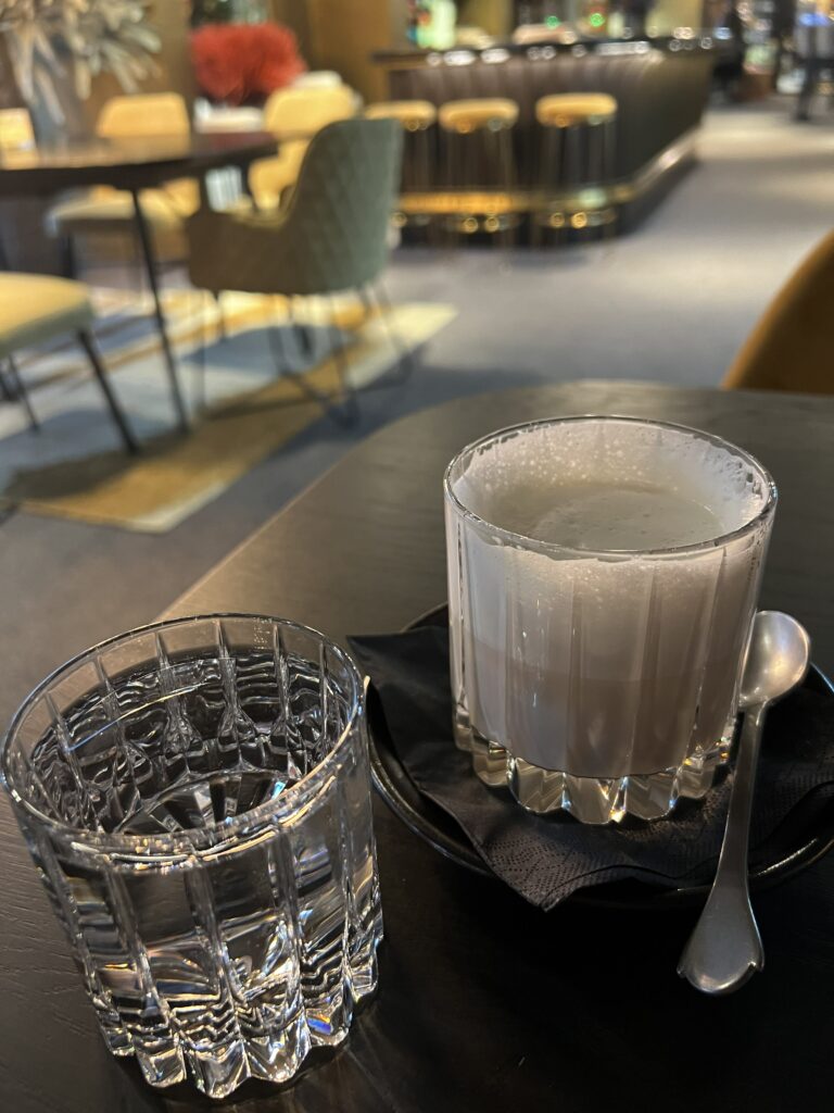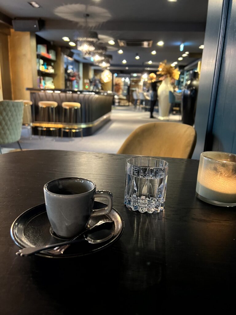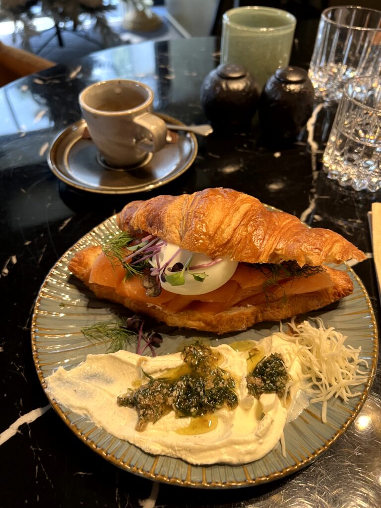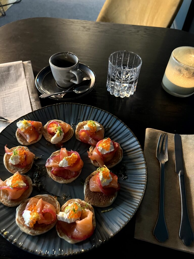 Für meinen ersten Morgen gab es Buchweizenblinis mit hausgebeiztem Lachs, Creme fraiche, Lachskaviar und Dill. Dazu gabs einen Espresso in einer sehr edlen Tasse – die man vermutlich im Store gegenüber erwerben kann. Die Blinis kann ich sehr empfehlen, die Kombi Lachs und Creme fraiche ist traumhaft und darunter scheint ein Dill-Zitronen-Gelee zu sein dass den Geschmack perfekt komplementiert.