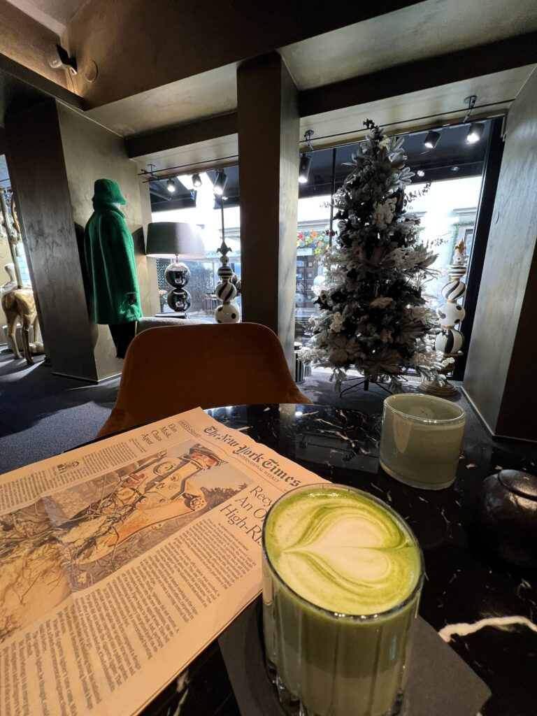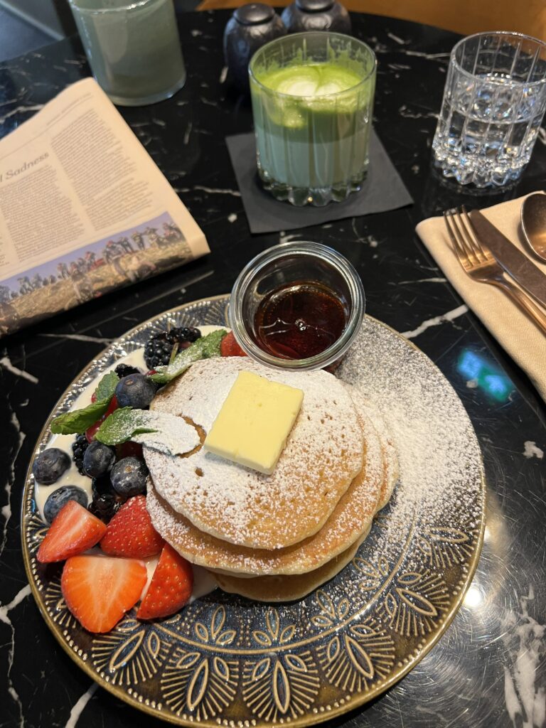 Ein weiterer Tag, ein weiterer Besuch, diesmal wurden es die Pancakes. Bei der Anrichtung habe ich etwas mehr erwartet, die Pancakes waren solide, die Früchte nicht saison-gemäßg (welche sind das auch?) aber das Kokosjoghurt balancierte die Süße sehr gut. Der mitbestellte Matcha Latte war leider etwas bitter, dafür gab es ein schönes Herz. Für interessierte anbei noch Ambiente Fotos, und die bereits passende Weihnachtsdekoration.
