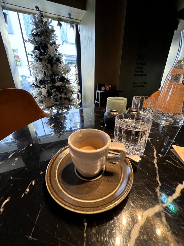 Schön weihnachtlich dekoriert gab es wieder mal Espresso und dazu das Croissant piquante mit Frischkäse, Räucherlachs, weichem Ei, Kren, Walnusspesto, Zitronensalz und Dillsenf.