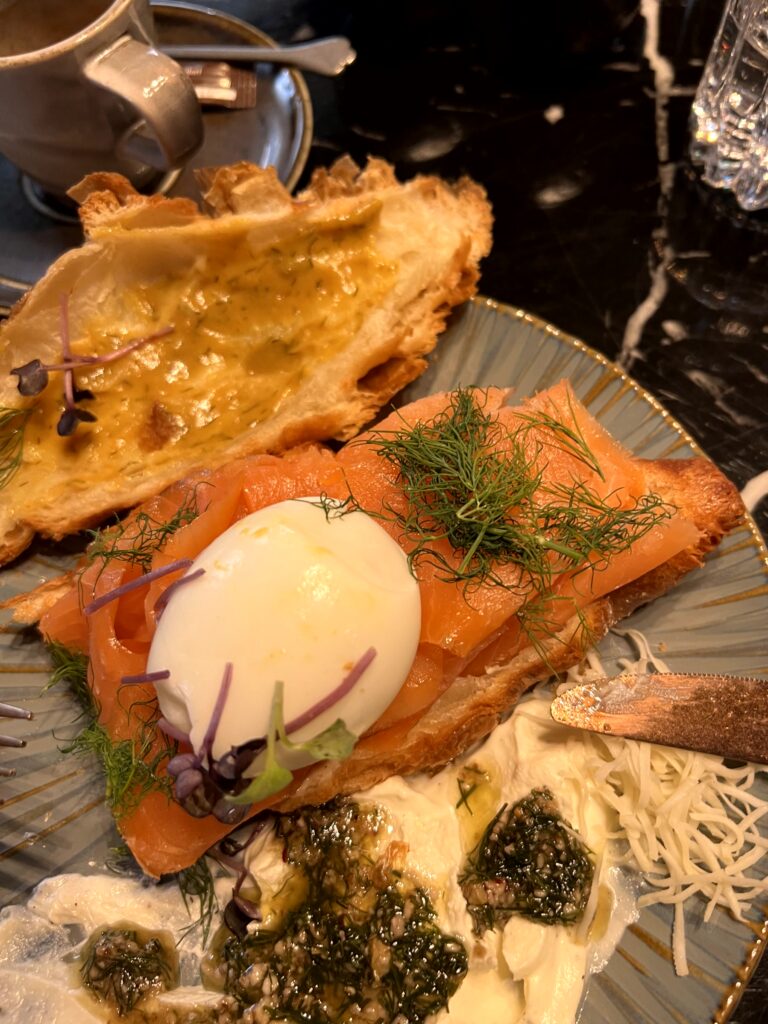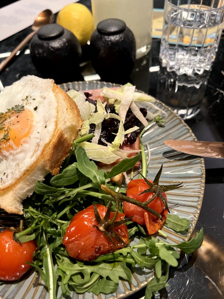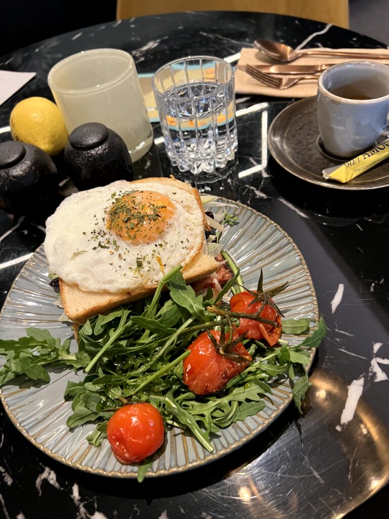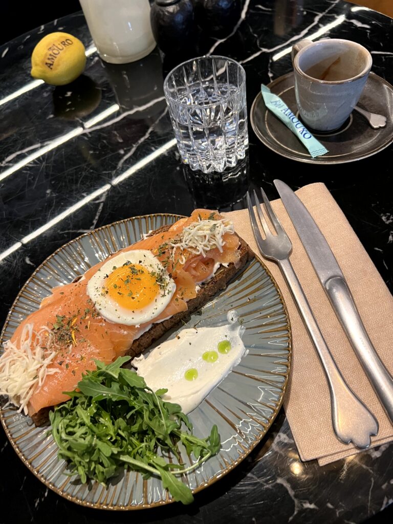 Am zweiten Morgen entschied ich mich für den Brioche Toast Amouro Sea mit flambierten Räucherlachs, Spinat mit Pinienkernen, im Ofen geschmorte Kirschtomaten, Minze und Spiegelei. Auch wenn das Gericht nicht so fotogen ist, geschmacklich war es ein Highlight und der ideale Start in den Tag. Auch wenn das Ambiente nicht ganz mein Fall ist und doch sehr extravagant wirkt, das Essen konnte mich überzeugen.