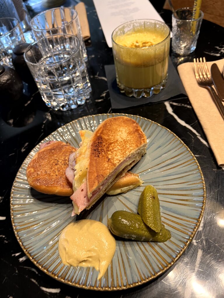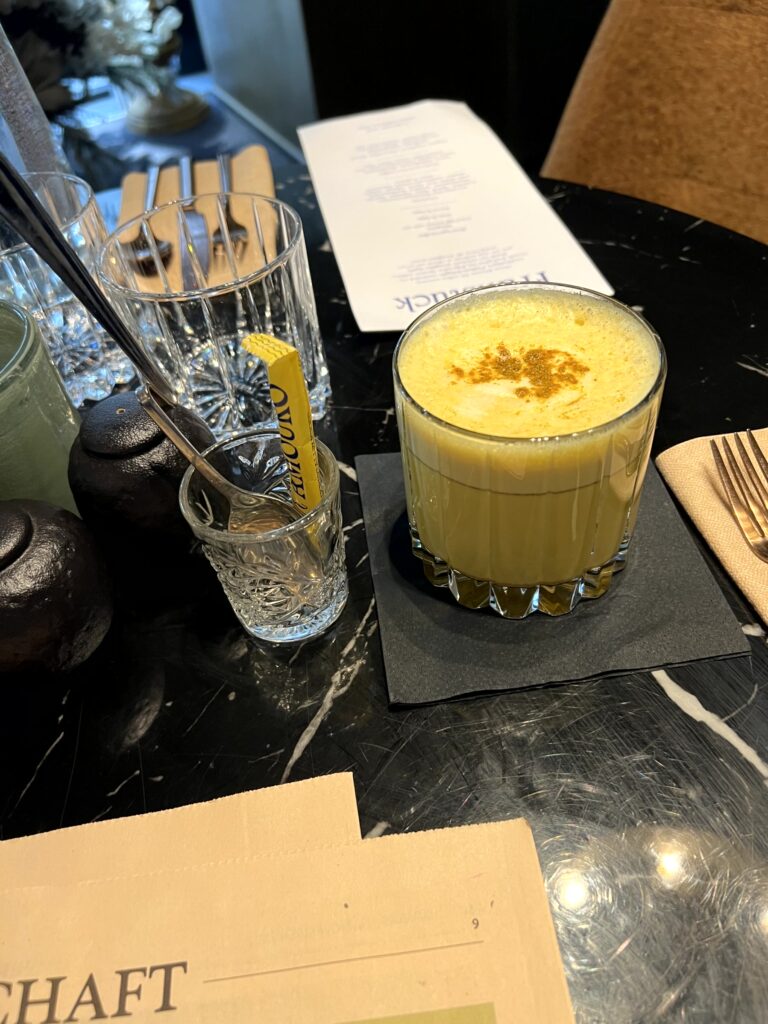 Amouro Grilled Sandwich, es darf auch einmal simpel sein. Buttermilch Weckerl, gebratener Backofenschinken, Emmentaler, Essiggurkerl und dazu Dijon Senf. Getränkemäßig gab es dafür etwas außergewöhnlicheres, einen Golden Latte, also Milch mit Kurkuma und Ingwer.