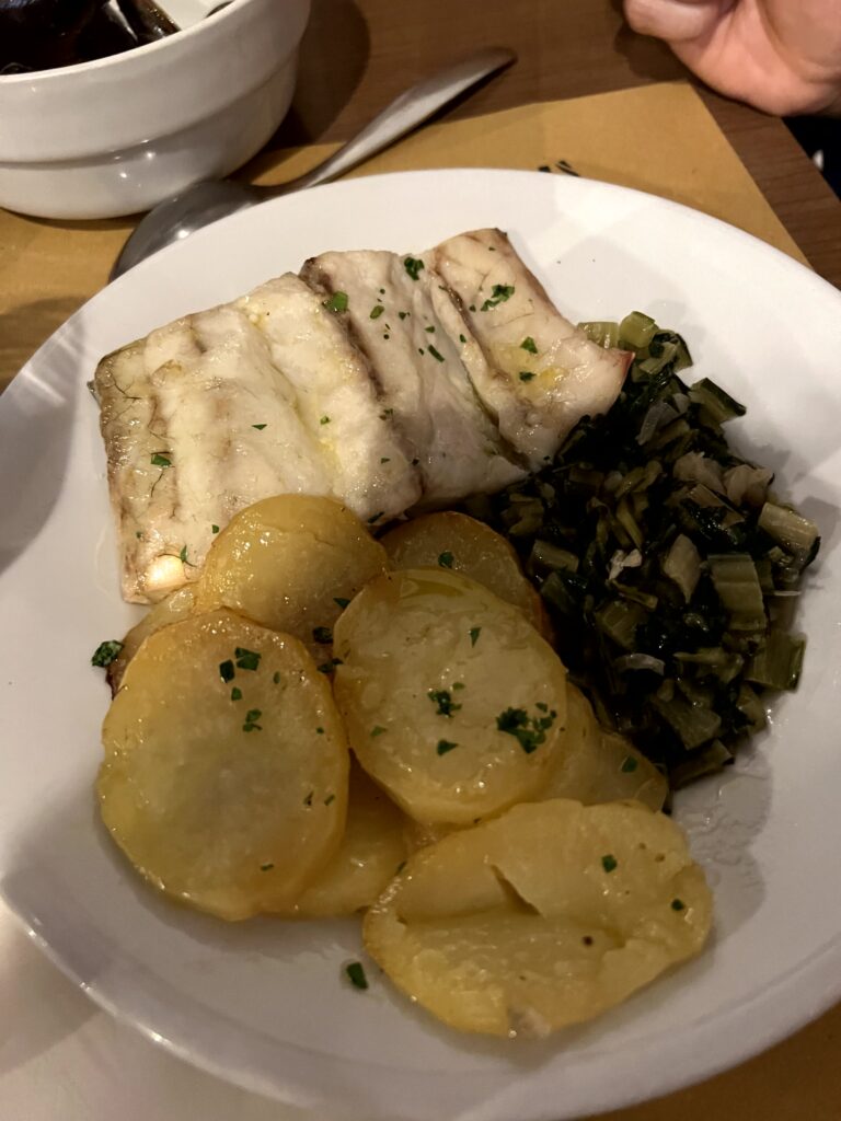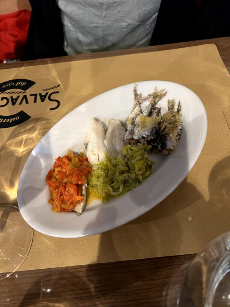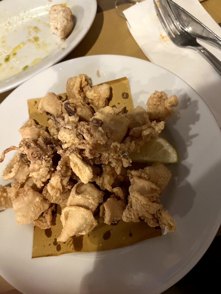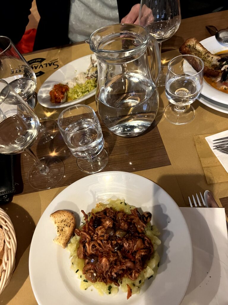 Ein zugegeben schräges Lokal bei gutem Essen war unser erster Stopp: die Osteria Salvagente in Triest. Gestartet wurde mit einem Antipasto mit drei verschieden zubereiteten Sardellen. Die Portionen sind nicht alzu üppig, ich hatte moscardini in umido, geschmorter Tintenfisch auf Erdäpfel. Danach musste noch eine Portion Calamari Fritti bestellt werden. Insgesamt eher teuer für die Größen, aber es hat gut geschmeckt.