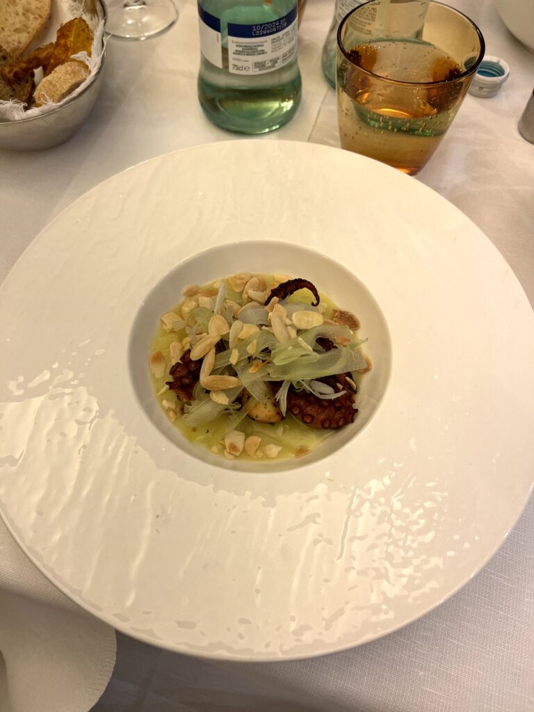 - Polipo scottato su crema di patate con sedano croccante, mandorle e limone