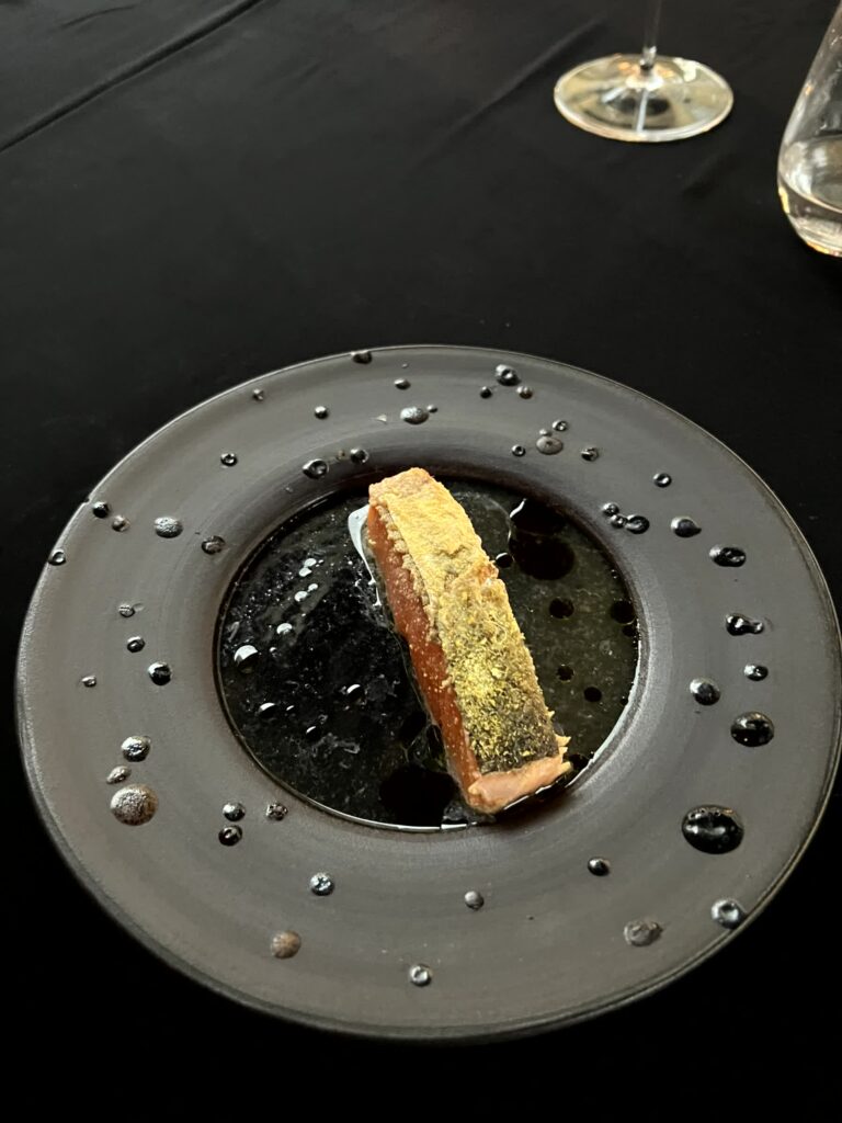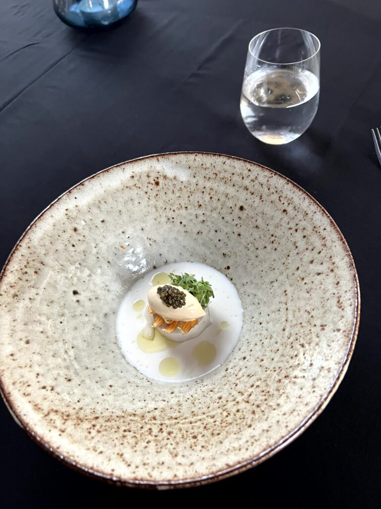 - Fisch umhüllt in Lardo mit Mandelcreme, Gänselebereis und Osietra Kaviar