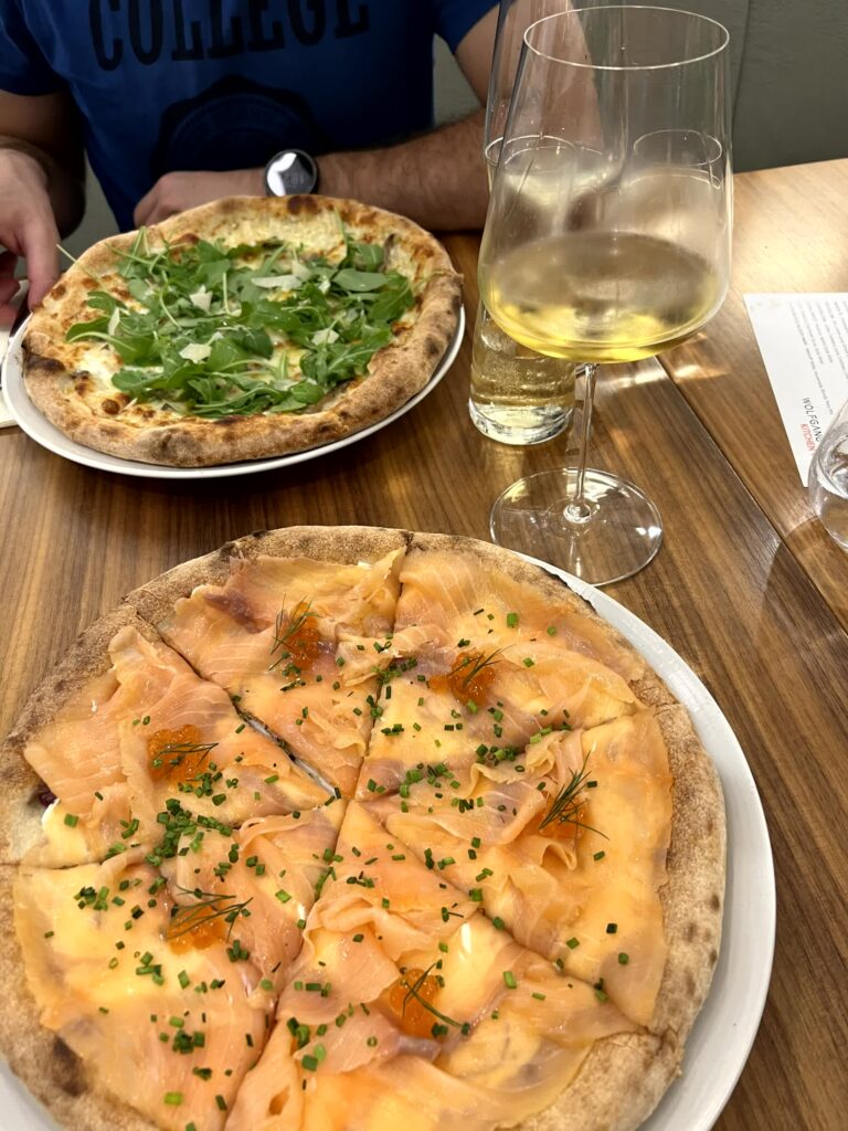 Gestartet hat es bei uns aber schon am Flughafen, eine Kochlegende wie Wolfgang Puck muss man austesten, auch wenn er nicht selbst kocht. Klar preislich nicht günstig, man ist schließlich auch am Flughafen, aber keinesfalls überteuert. Der Cornetto war sehr gut und die Pizza war ein Traum (Der Hype ist gerechtfertigt!). Zum trinken gab es Nordamerikanisches: Sauvignon Blanc 2019 von Wolfang Puck, leider nichts aufregendes, wenn man regionale Weine gewohnt ist dann auch zu süß. Es folgte jedoch ein Hit, Chardonnay 2019 von DAOU in Paso Robles. Zwar auch wieder Kalifornisch aber viel besser. Passte perfekt zur Pizza.