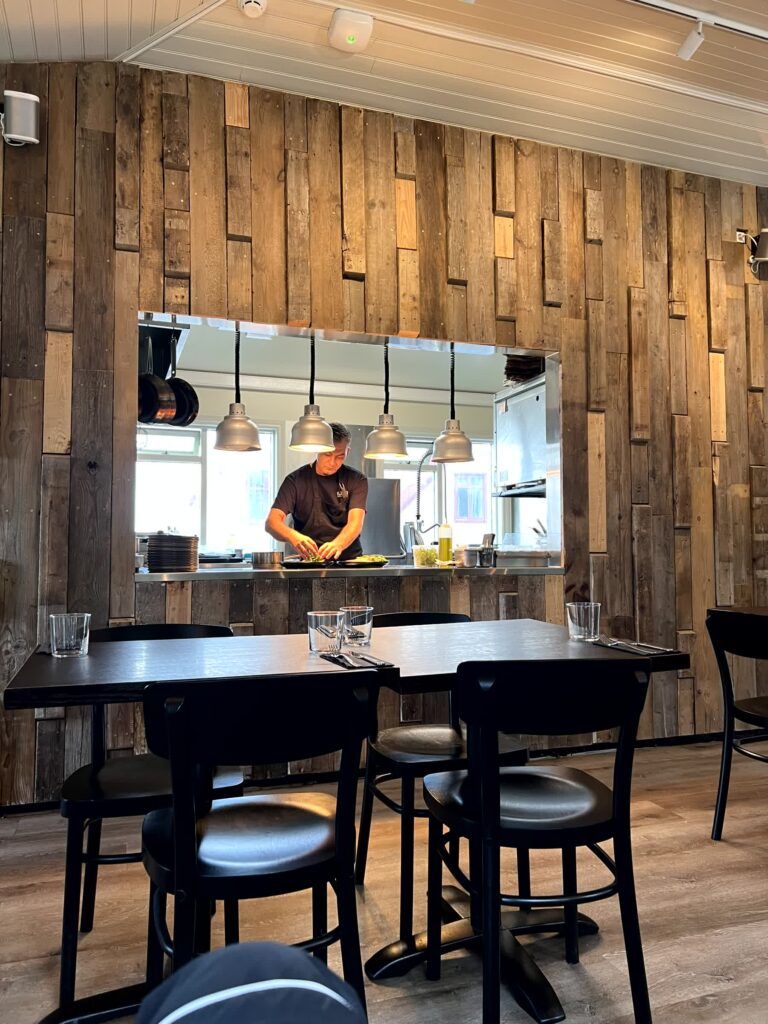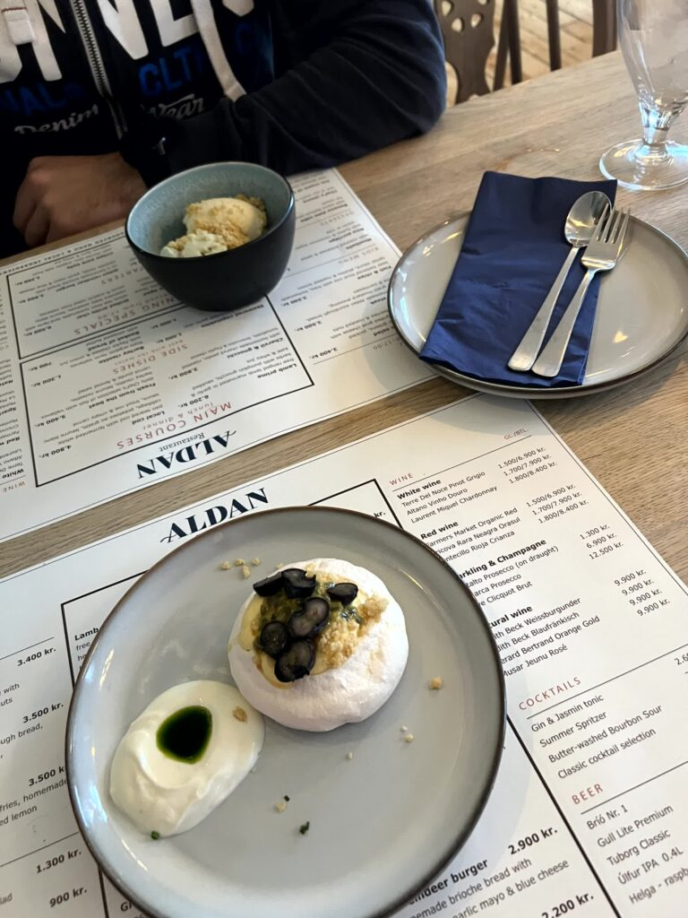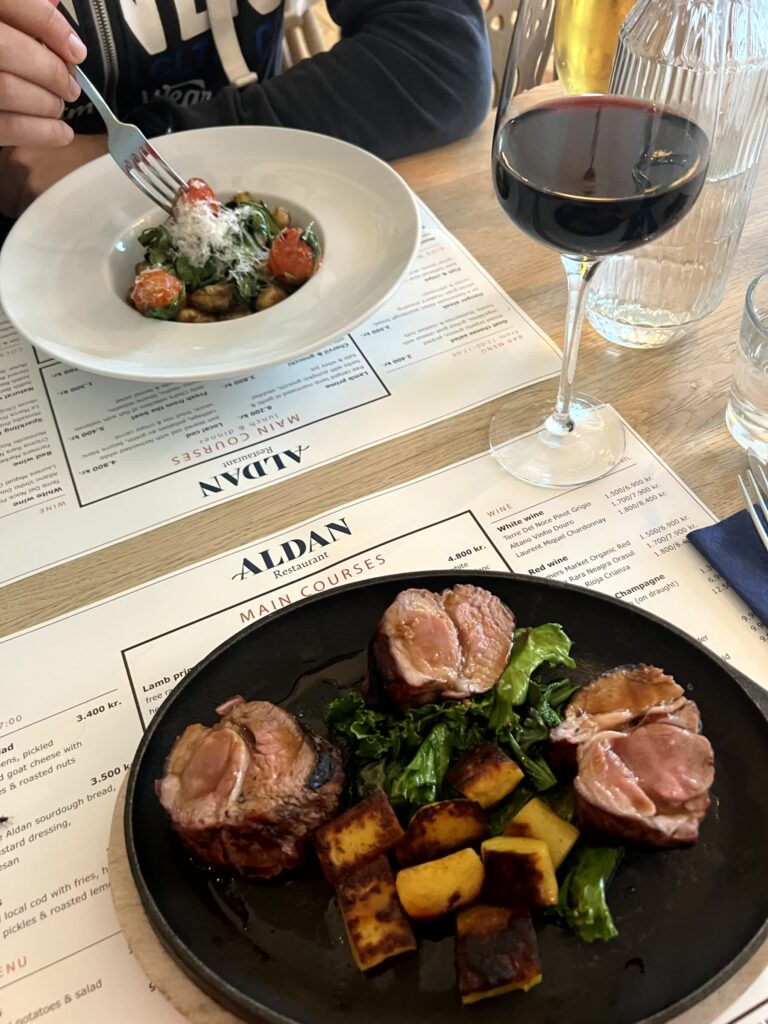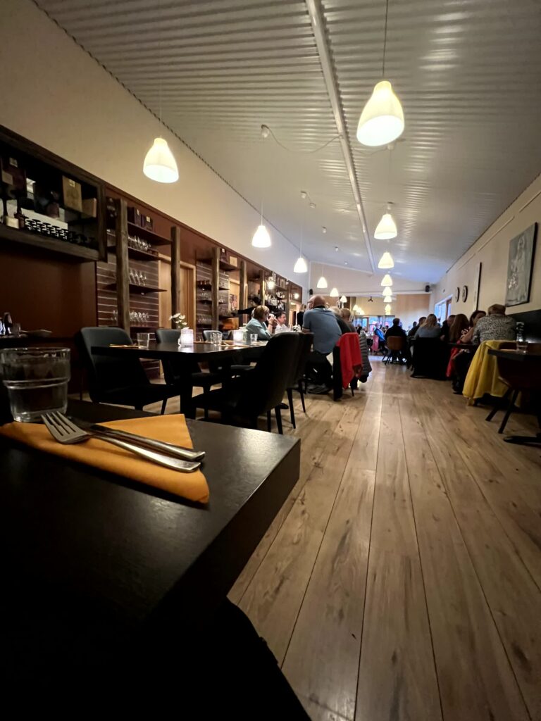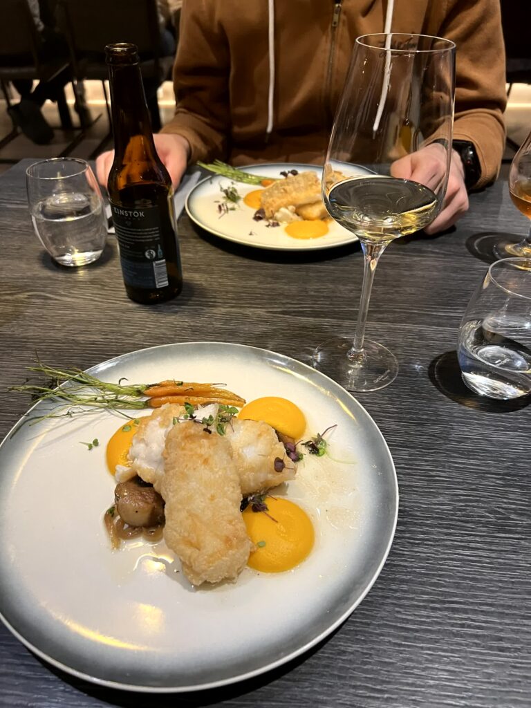 Wieder moderner und direkt neben einem Wasserfall war das Kjarr in einer unscheinbaren kleinen Stadt. Bis zu dem Zeitpunkt das beste Restaurant. Interessant zuzuschauen war die offene Küche und mehr einheimische als erwartet. Auch bei den nicht-alkoholischen Getränken waren sie sehr hilfsbereit und empfahlen schnell eine Rotwein Alternative mit Johannisbeere.