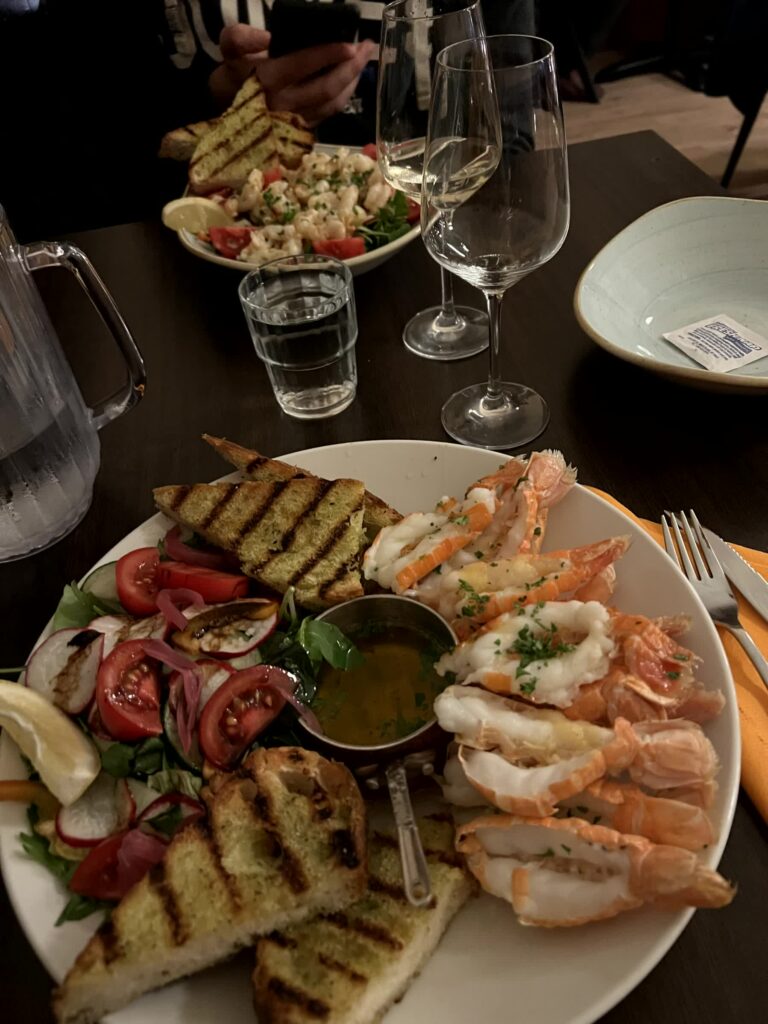 - Roasted langoustines (300g) with garlic butter, served with salat and garlic bread