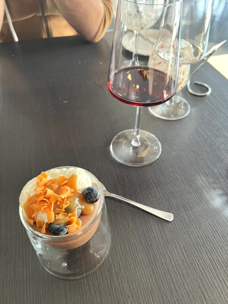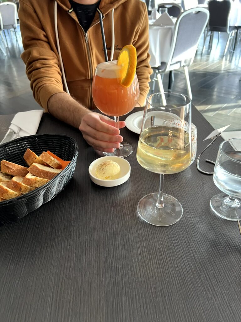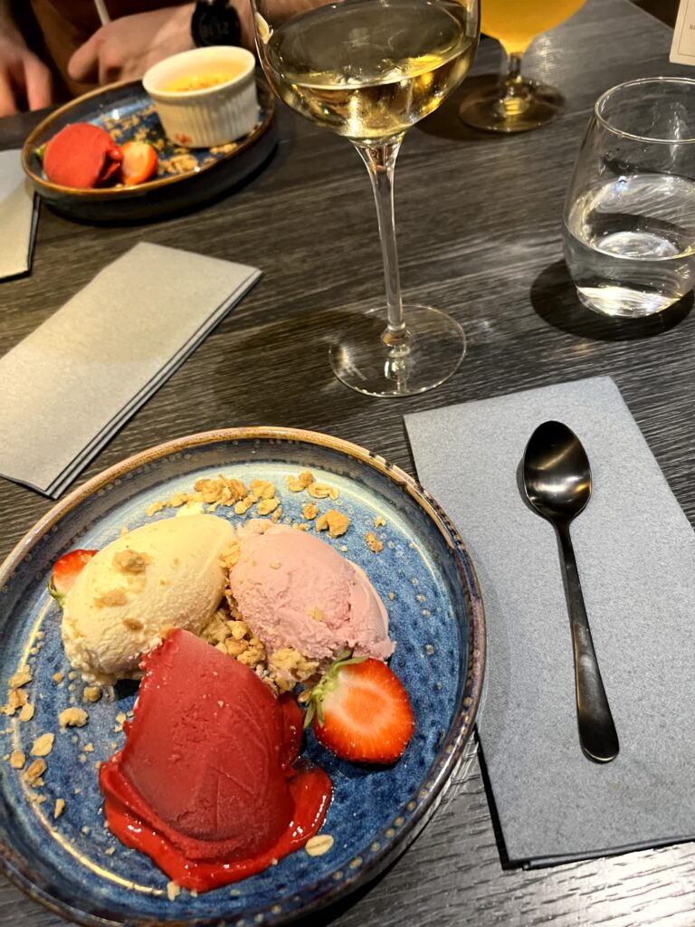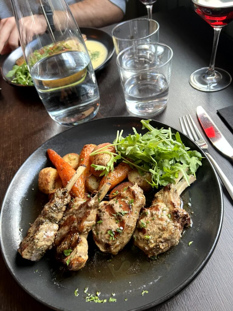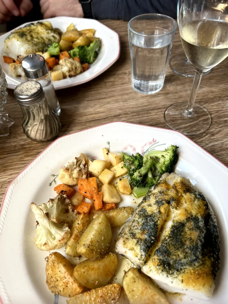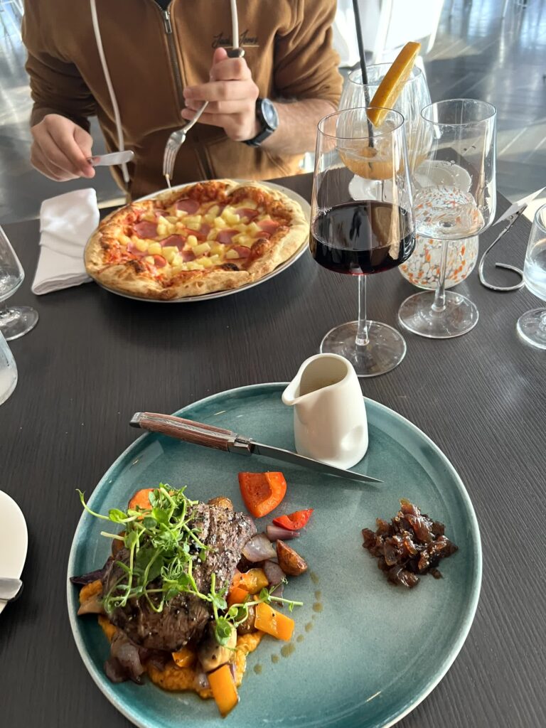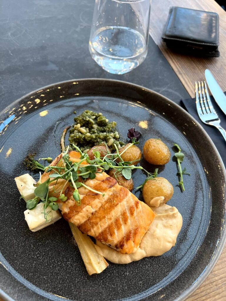 In Allem seher solide und schön angerichtet. Dazu gab es Wein aus Chile, enttäusche nicht! Aber man merkt schon, viel Auswahl gibt es nicht. Als Fisch gab es entweder Dorsch (Cod) oder Seesaibling (arctic char), wobei man zweiteren halt bei uns sehr oft bekommt deshalb hab ich ihn nie gegessen. Oder sonst gibt es Lamm entweder von der Krone oder der Keule. Und Steak wird ebenfalls oft angeboten aber preislich spielt das dann nochmal in einer anderen Liga.