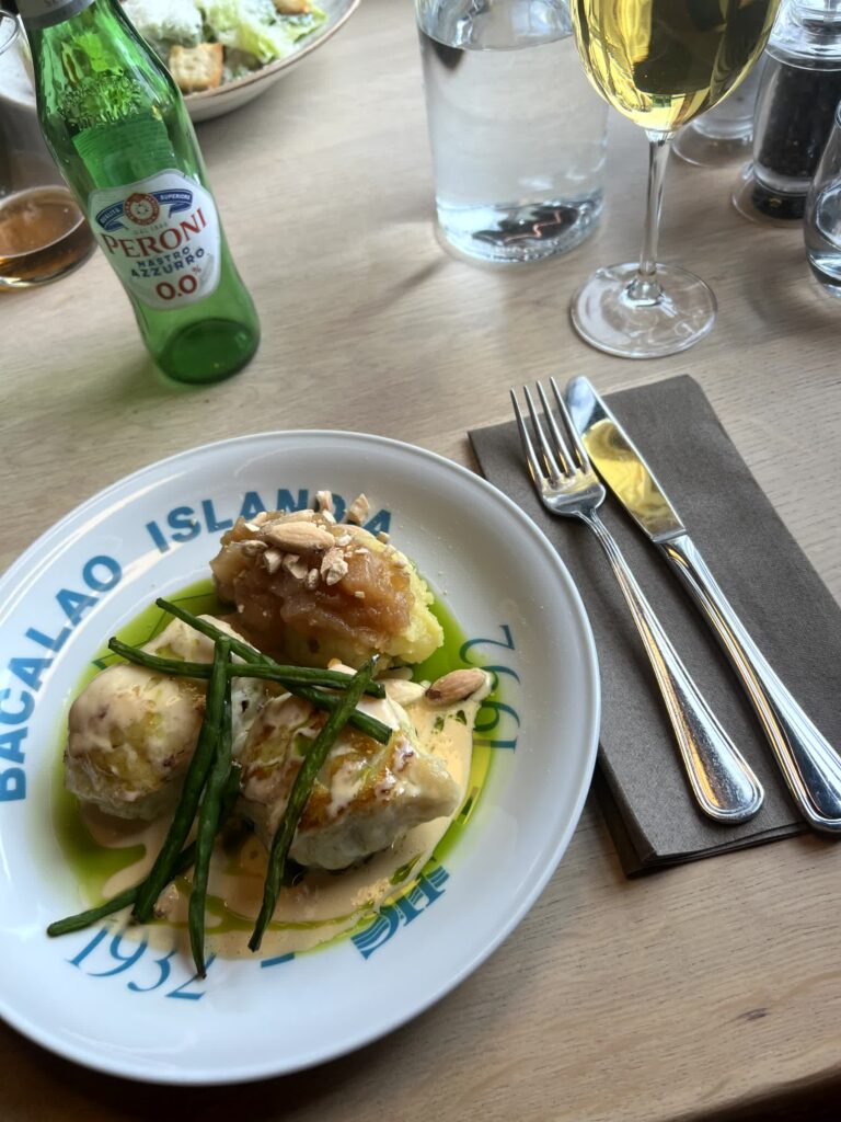 - Fish of the day (Icelandic cod, potatoes, apple, kale, almonds, langoustine sauce)
