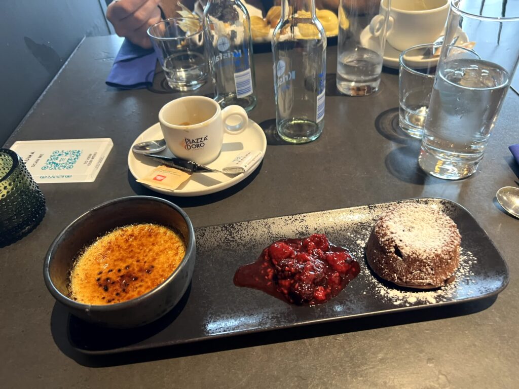 - Dessert Duo: Hot chocolate fondant with an espresso cream brulee and marinted berries