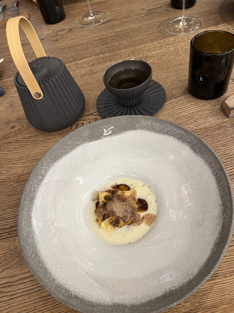 - Dotterraviolo mit Cremespinat und Parmesanemulsion, Trüffeljus und weißer Trüffel aus Istrien