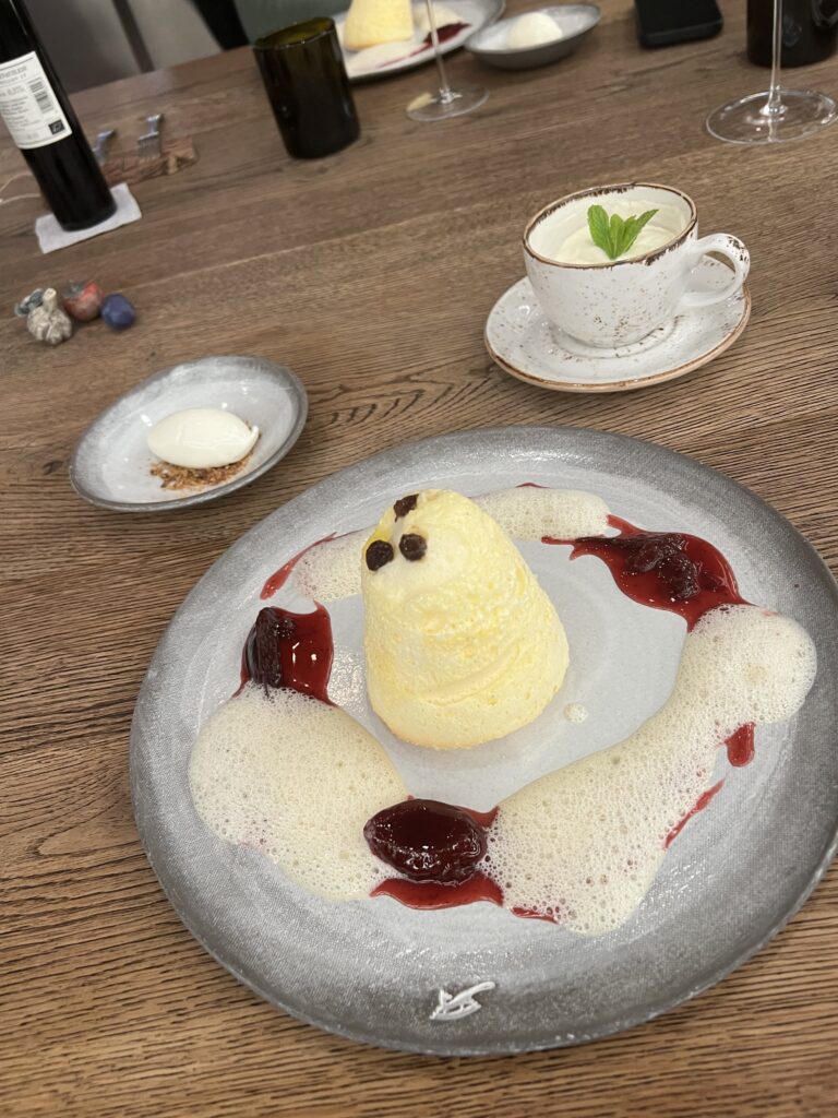 - Souffle vom Sernauer Topfen mit Zwetschkenröster & Vanillesauce, Sauerrahmeis mit karamellisierter weißer Schokolade
