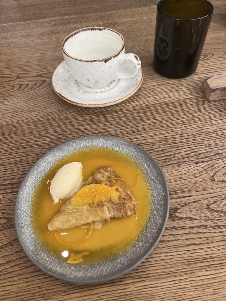 Man beachte die Getränkekombinationen, es war immer etwas mehr und etwas dass man auch zu Hause zubereiten würde. Geschätzt hab ich die Kombi aus lokalem (Schlein, Sausal) und externem (Mittelmeer). Es muss nicht immer hyper-lokal sein, was dieses Menü sehr gut zeigt. Und wenn man glaubt das Menü ist zu Ende kommt auf einmal der Servierwagen und es wird Crepe Suzette vor einem zubereitet. Ein wirklich gelungener Abschluss.