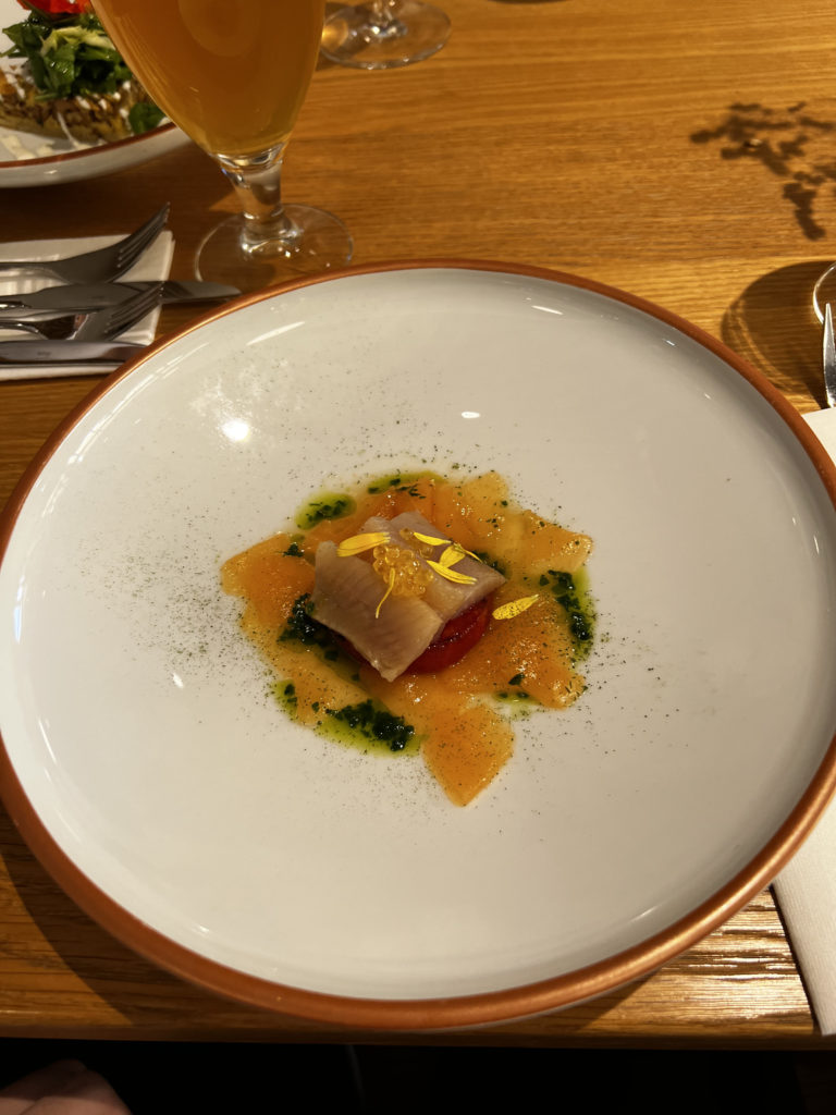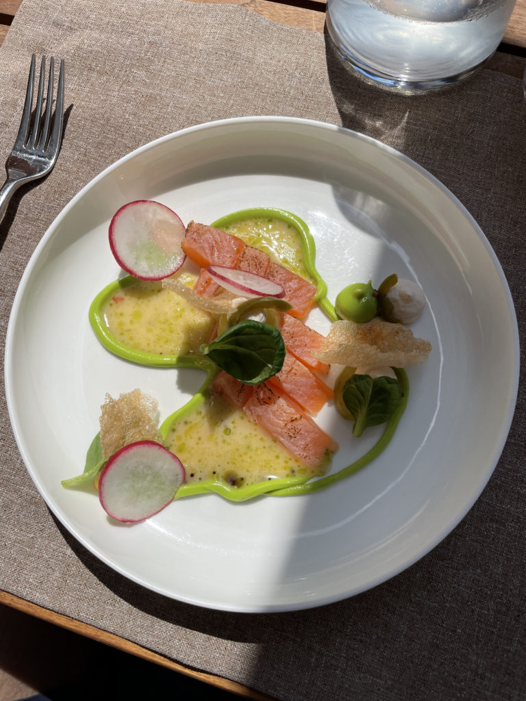 Gang I: Lachs geflämmt, Libanesischer Frischkäse (Labneh), Tapioka Chips, Calamansi Zitrussud, Avocadocreme, Spicy Mayo
