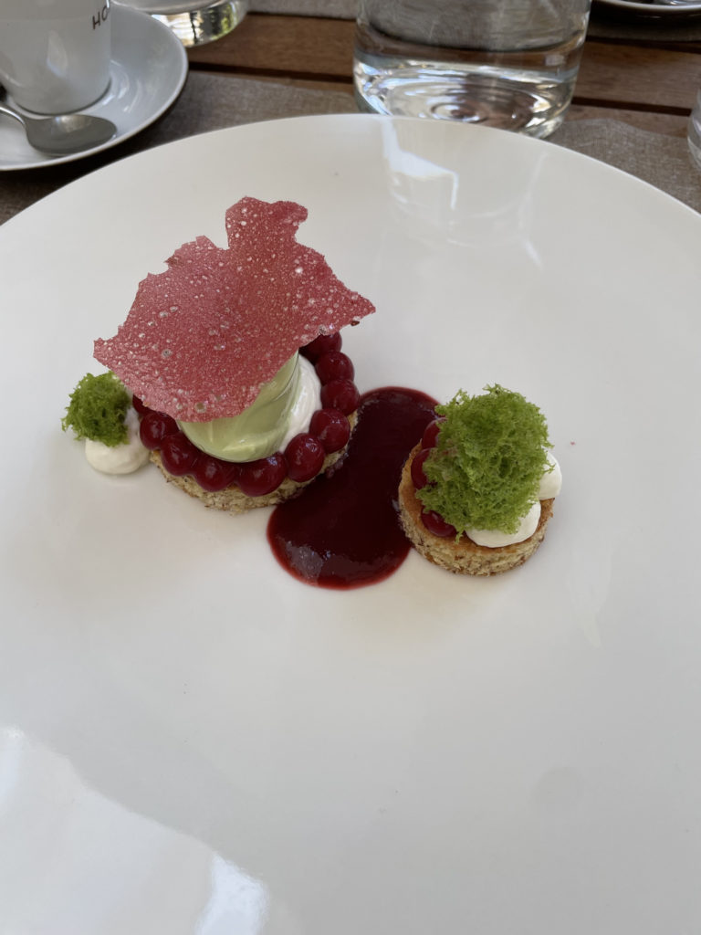 Gang IV: Mandelkuchen, Sauerampfersorbet, Himbeerchips, Sponge