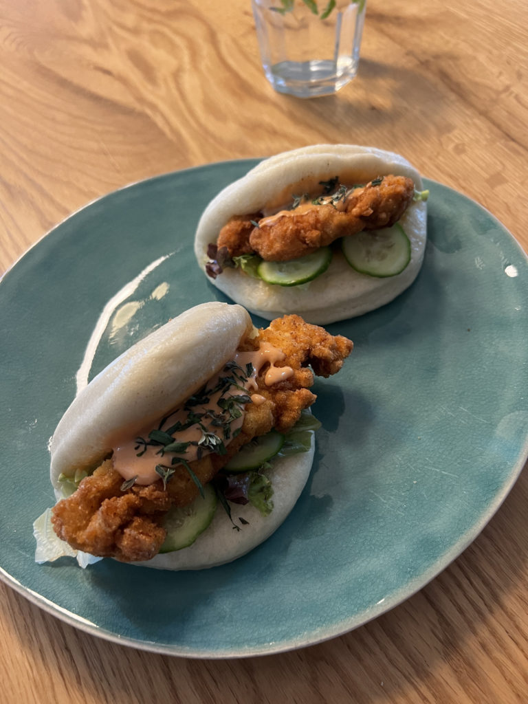 Unbedingt zum ausprobieren! Bao Buns gedämpft mit frittiertem Huhn, Spicy Mayo, Salat und Gurke