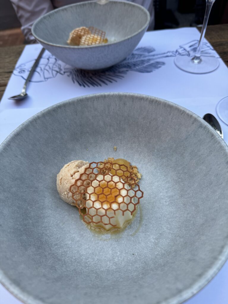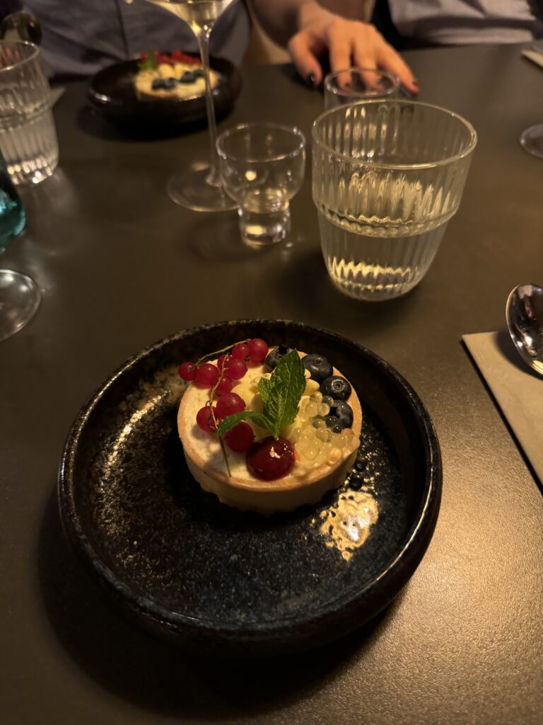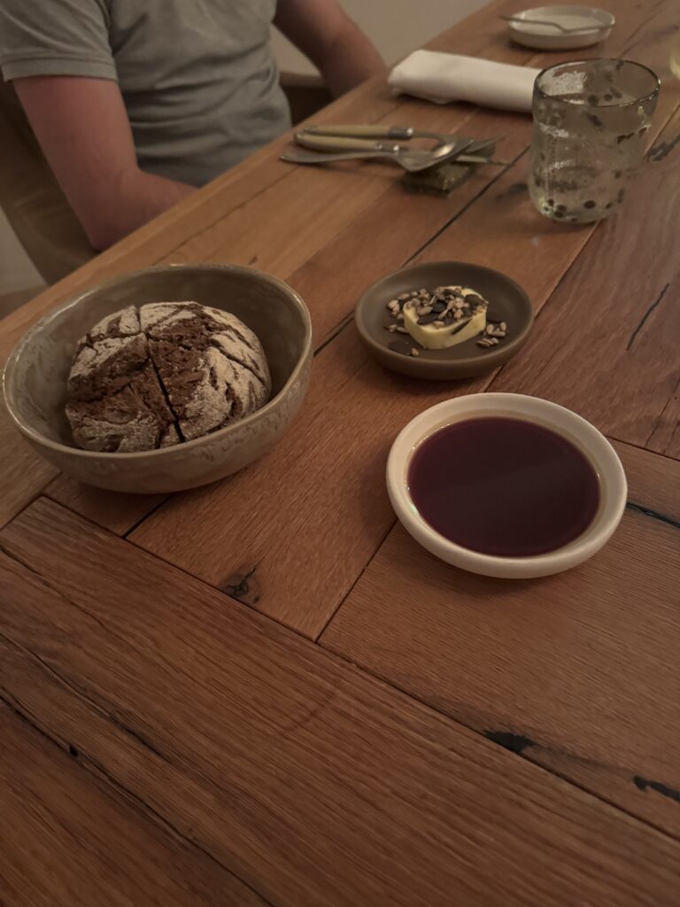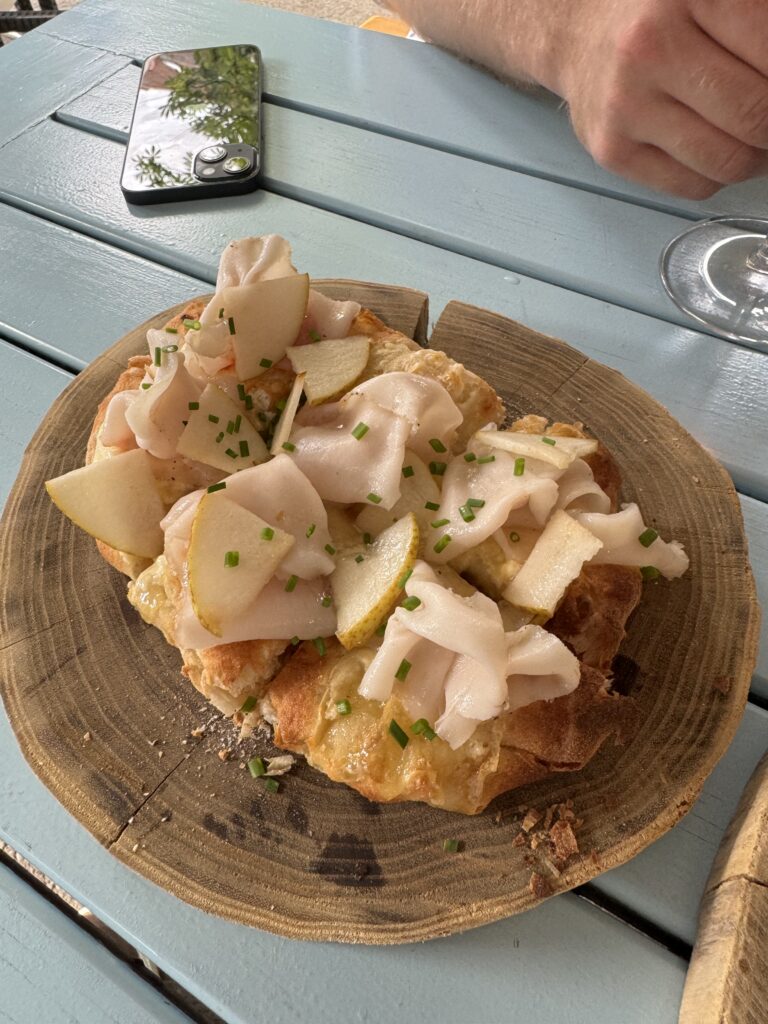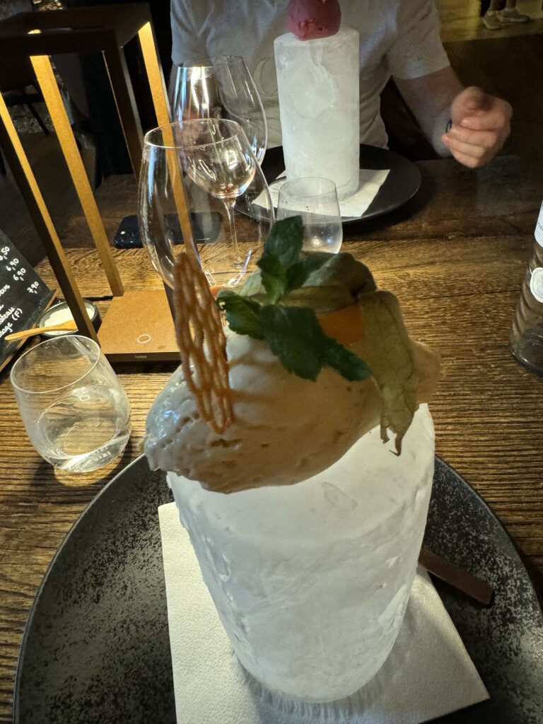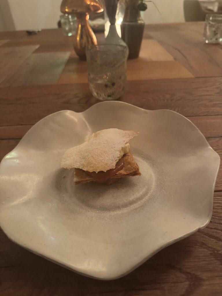 Der Abschluss war mir dann etwas zu experimentell nach einem doch traditionellem Mahl. Blätterteig, Krennmousse, getrocknete Milchhaut und Birne. In der Gesamtkombination schon passend, aber für mich nicht der richtige Abschluss zur Gans.
