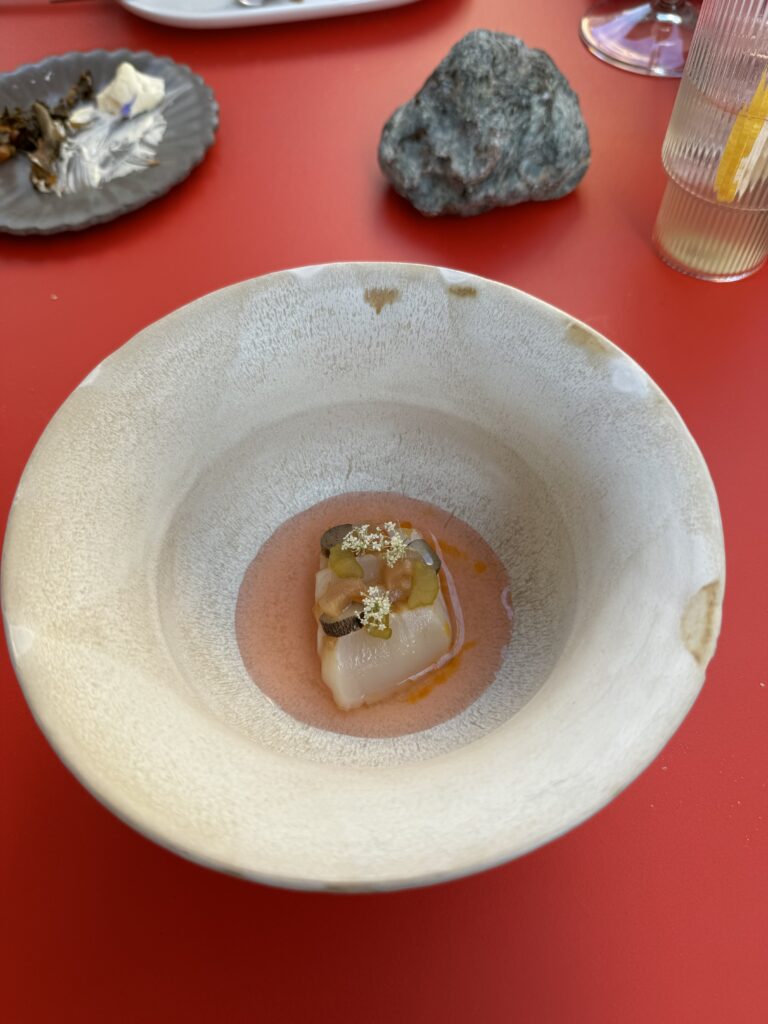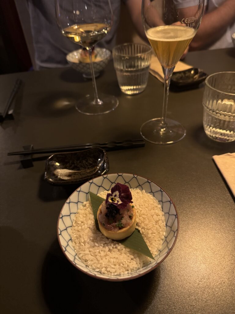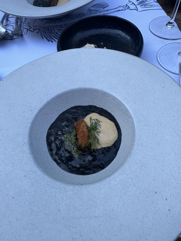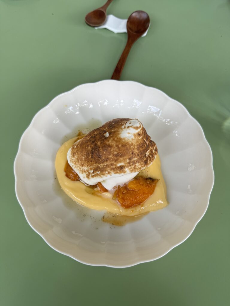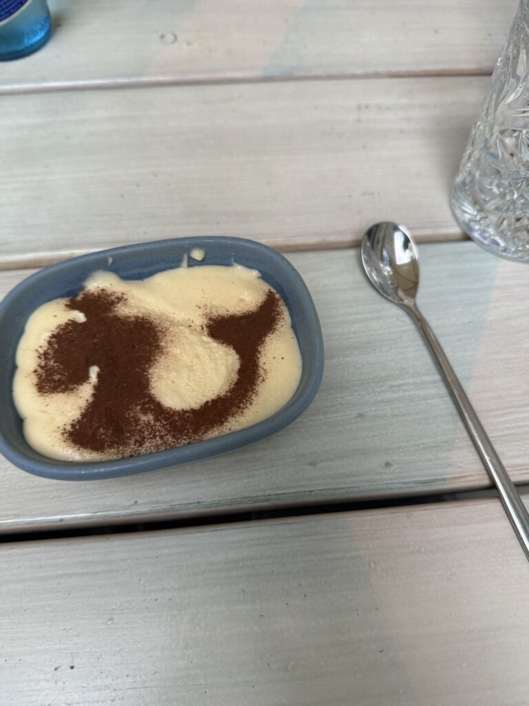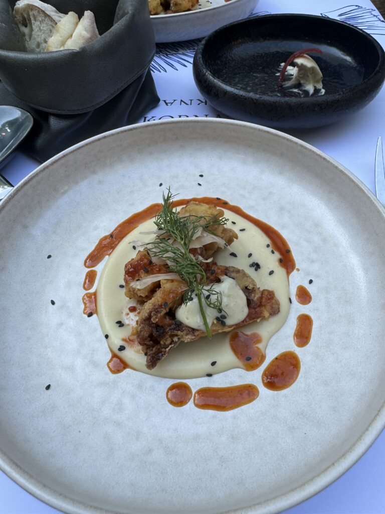 Der Abschluss war mir dann etwas zu experimentell nach einem doch traditionellem Mahl. Blätterteig, Krennmousse, getrocknete Milchhaut und Birne. In der Gesamtkombination schon passend, aber für mich nicht der richtige Abschluss zur Gans.