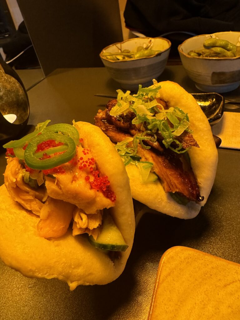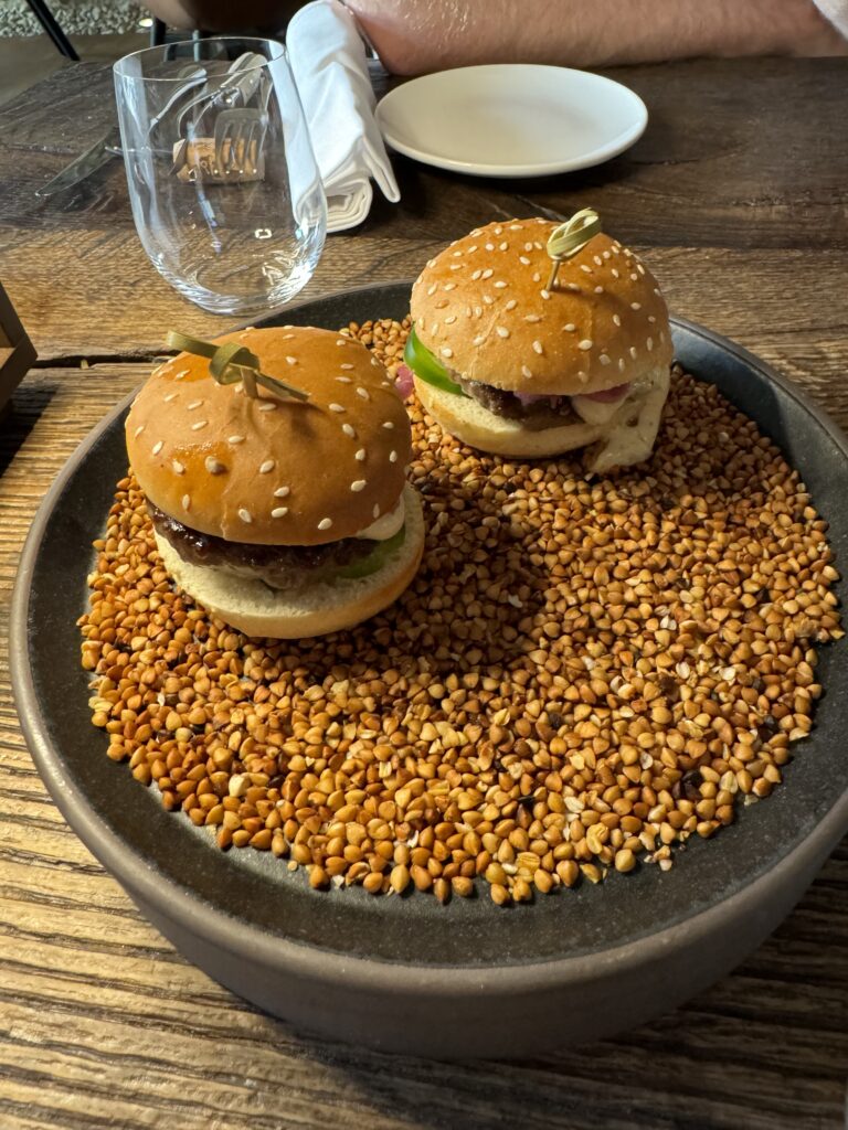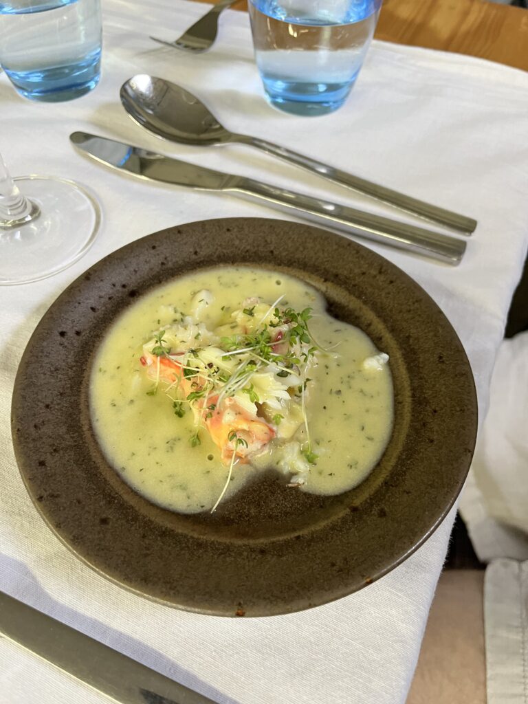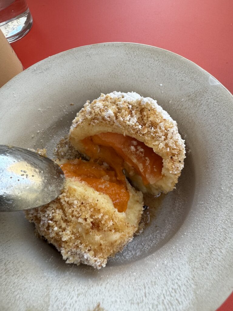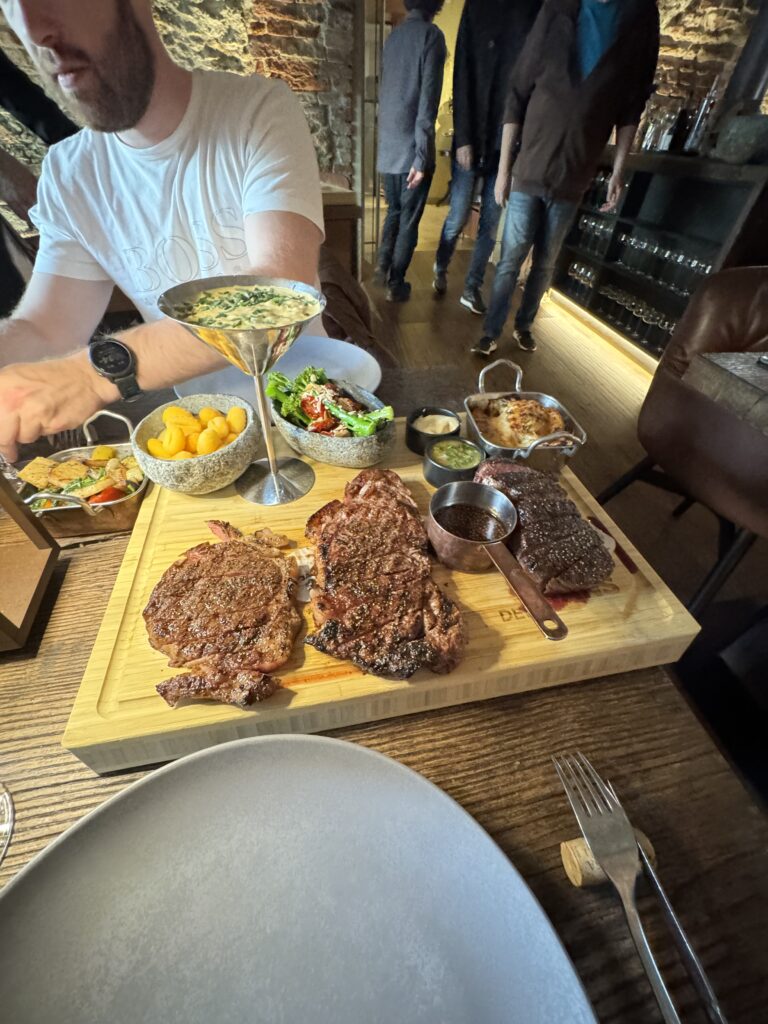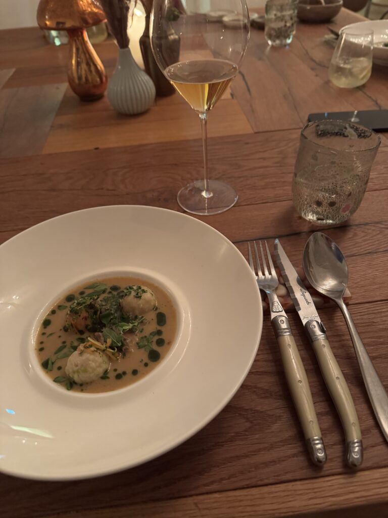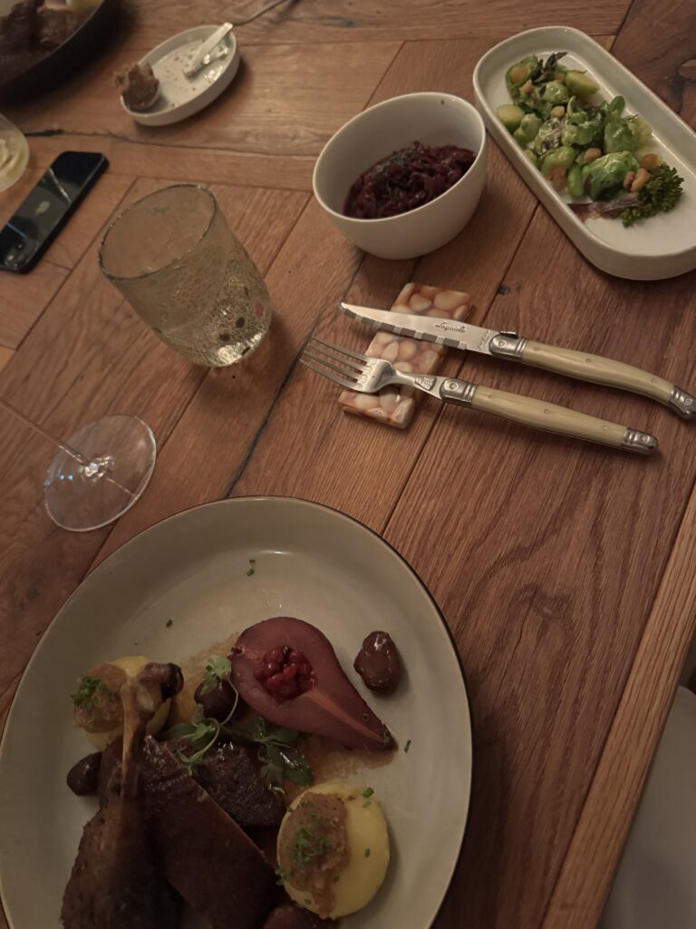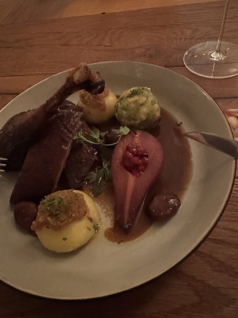 Spätestens seit dem Knödelbuch (woran auch Katharina Seiser gearbeitet hat) lernte ich auch Knödel wertzuschätzen. An diesem Abend gleich mit drei Varianten vertreten war es mir dann aber fast zuviel Kohlenhydrate auf einmal. Meine Lieblingsbeilage war aber das Rotkraut, die leichte Schärfe harmonierte perfekt dazu. Das gesunde Highlight waren die Kohlsprossen – zum sonst eher schweren Gericht. Die Gans war richtig knusprig und das Fleisch sehr mürb. Die Sauce gesellte sich dennoch gerne dazu.