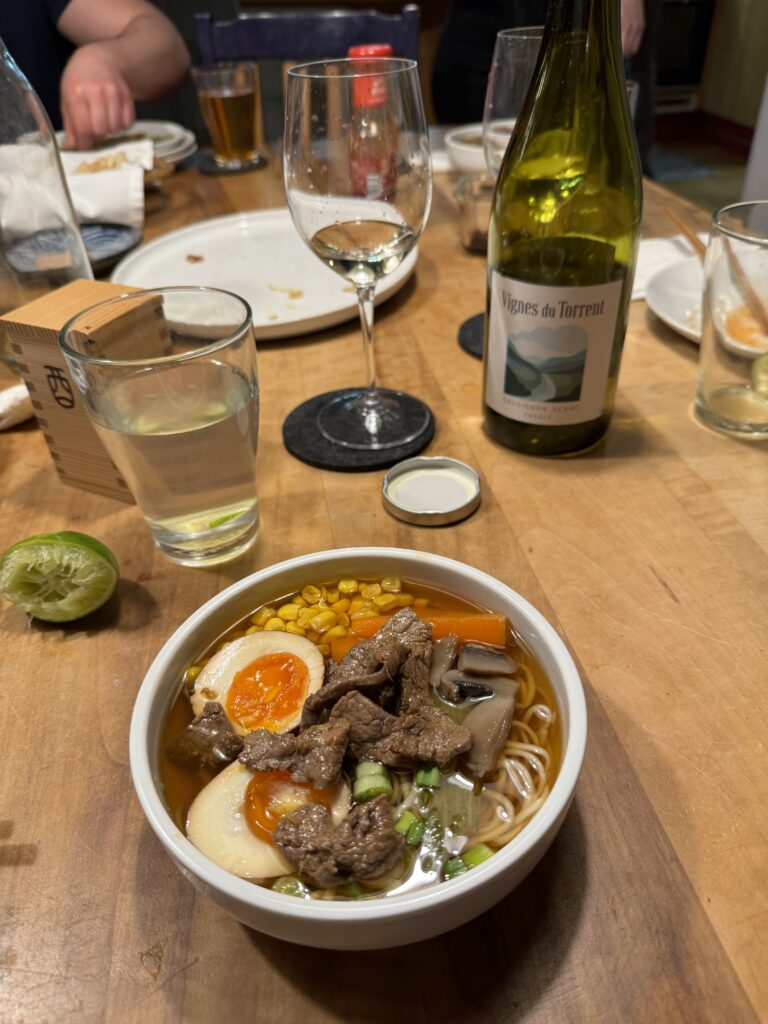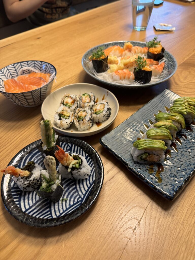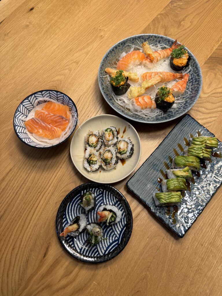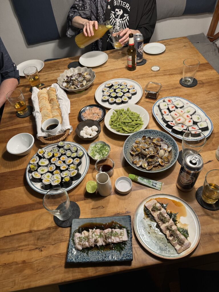 In meinem Freundeskreis probierten wir ein neues Konzept aus: Bring-your-own-Food. Das ganze mit einem Thema, diesmal japanisch, kombiniert gab wunderbare Kreationen. Nicht im am Bild war die Vorspeise, die Gyoza. Am Bild: Venusmuscheln, div Maki und Rolls, Edamame, Reiscracker, getrüffeltes Schwertfisch Sashimi mit Ponzu, geniales Ramen in verschiedenen Varianten, Versuch von Matcha Mochis und Tapioka Purin.
