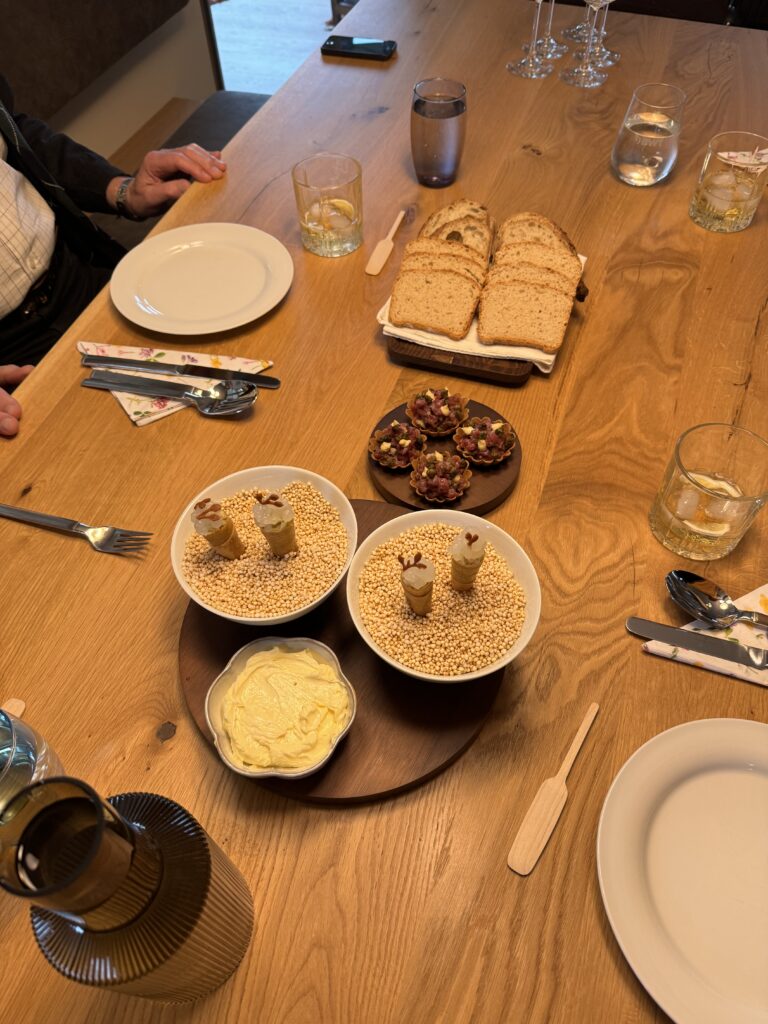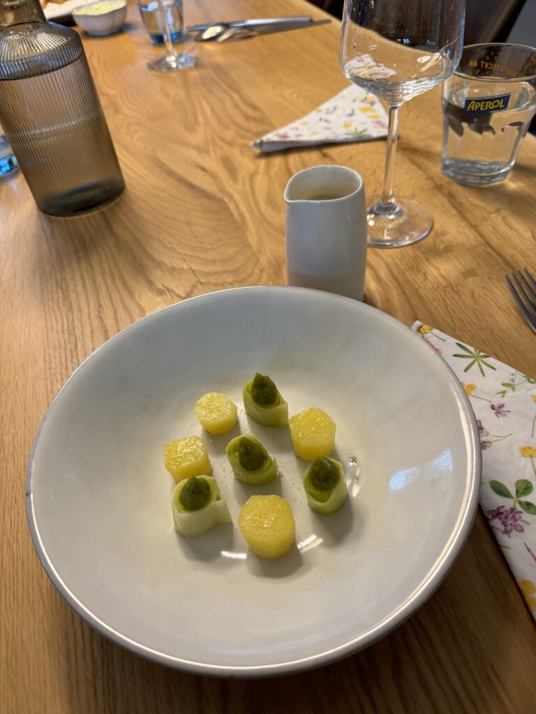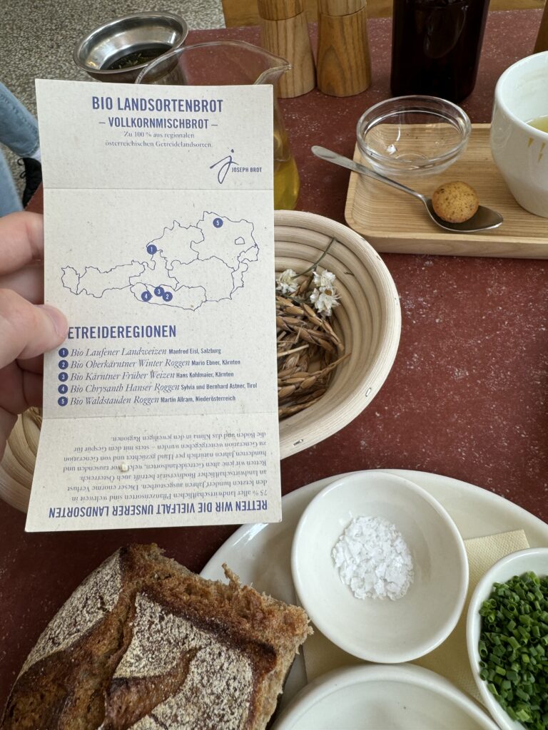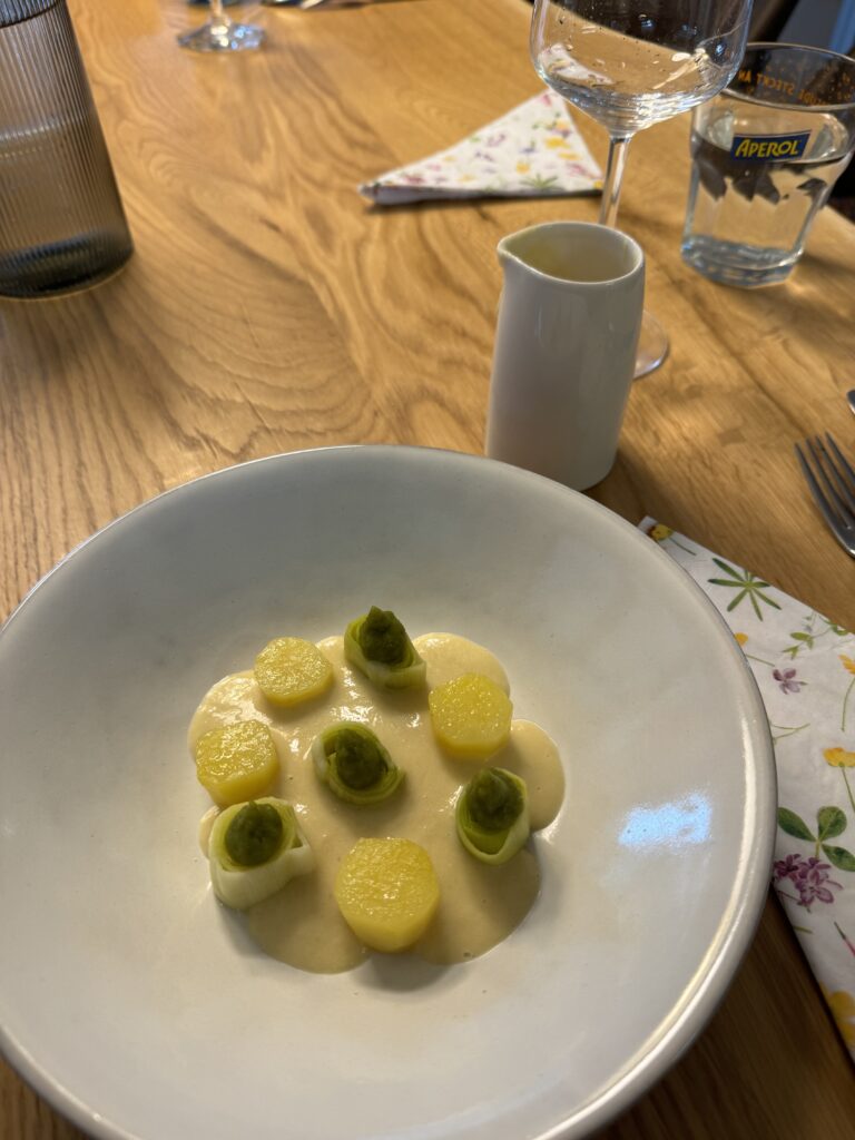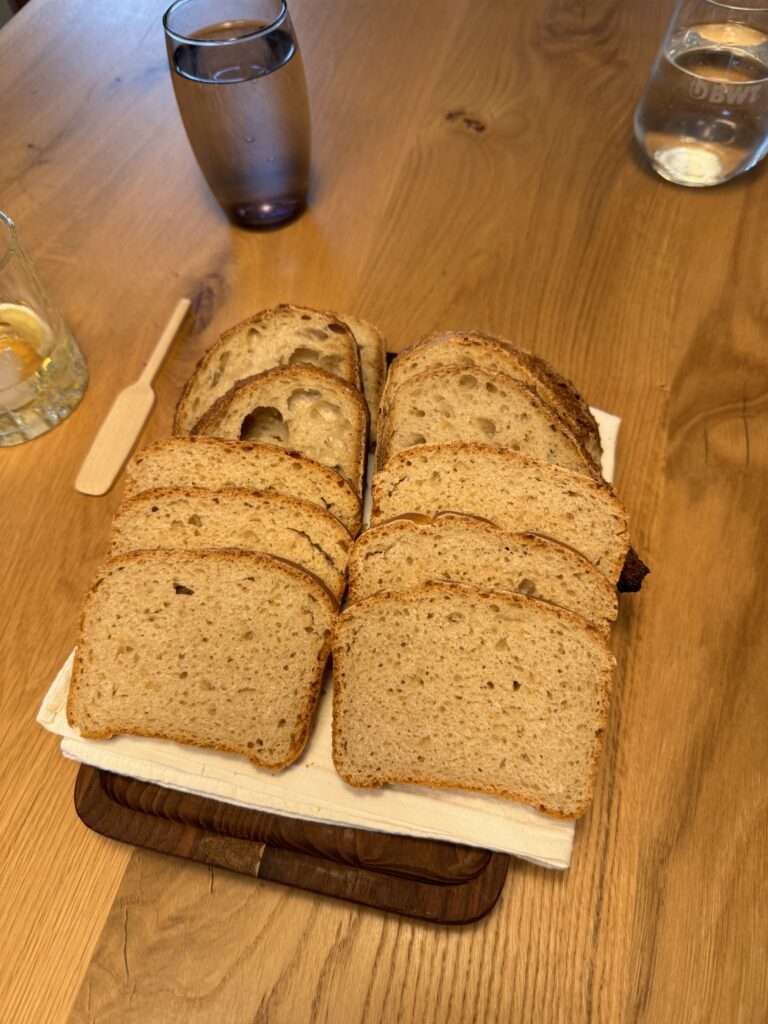 Nächster Tag, neue Erfahrungen. Frühstück entfiehl „Magen-gerecht“, da am Vorabend doch ein bisschen viel Wein floss. Ein Landsorten Brot mit Rohmilchbutter von Joseph Brot und Kirishma Sencha ließen mich gut in den Tag starten. Zu Mittag einen schnellen Besuch in der Meierei für einen wirklich guten Frühlingssalat und super gebratenen Karpfen. Der Apfelstrudel durfte natürlich nicht fehlen.