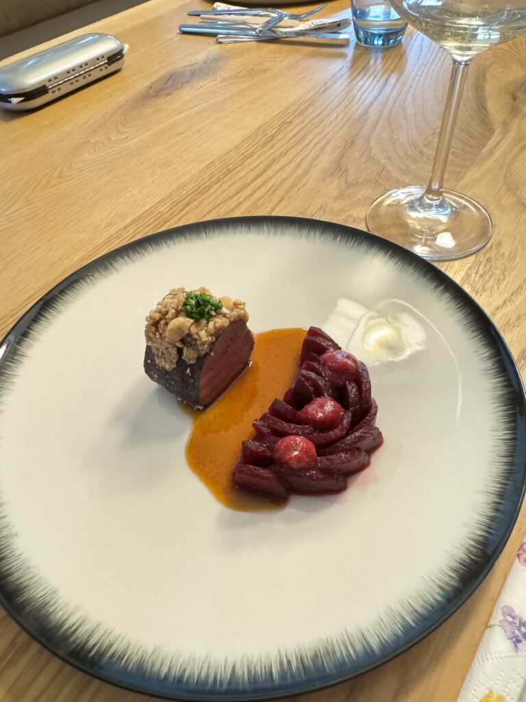 Rehrücken mit Haselnusskruste und eingelegter Rote Rübe
