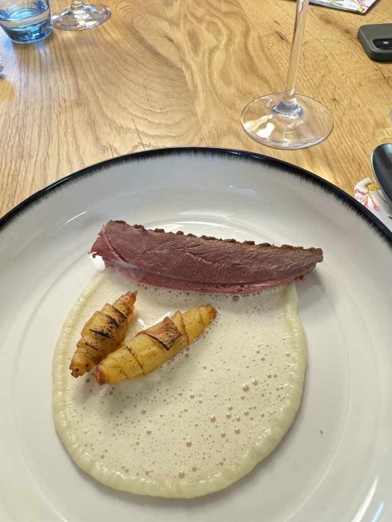 Entenbrust am Knochen gegart mit Topinamburpüree, Croissant Erdäpfel und Sauce Supreme