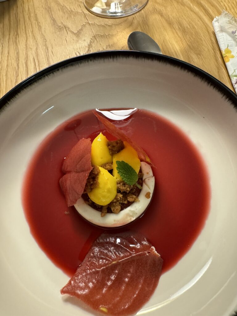 Joghurtmousse, Himbeerpüree, Mandelbrösel, Limettencreme, Himbeerblätter und Himbeersud