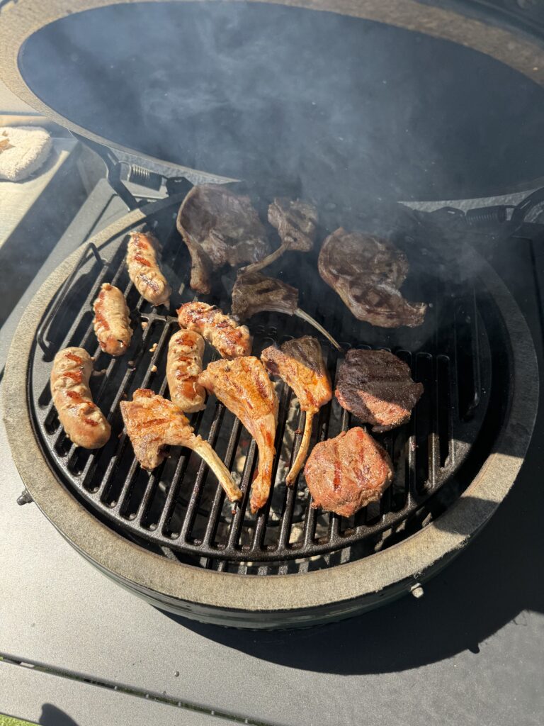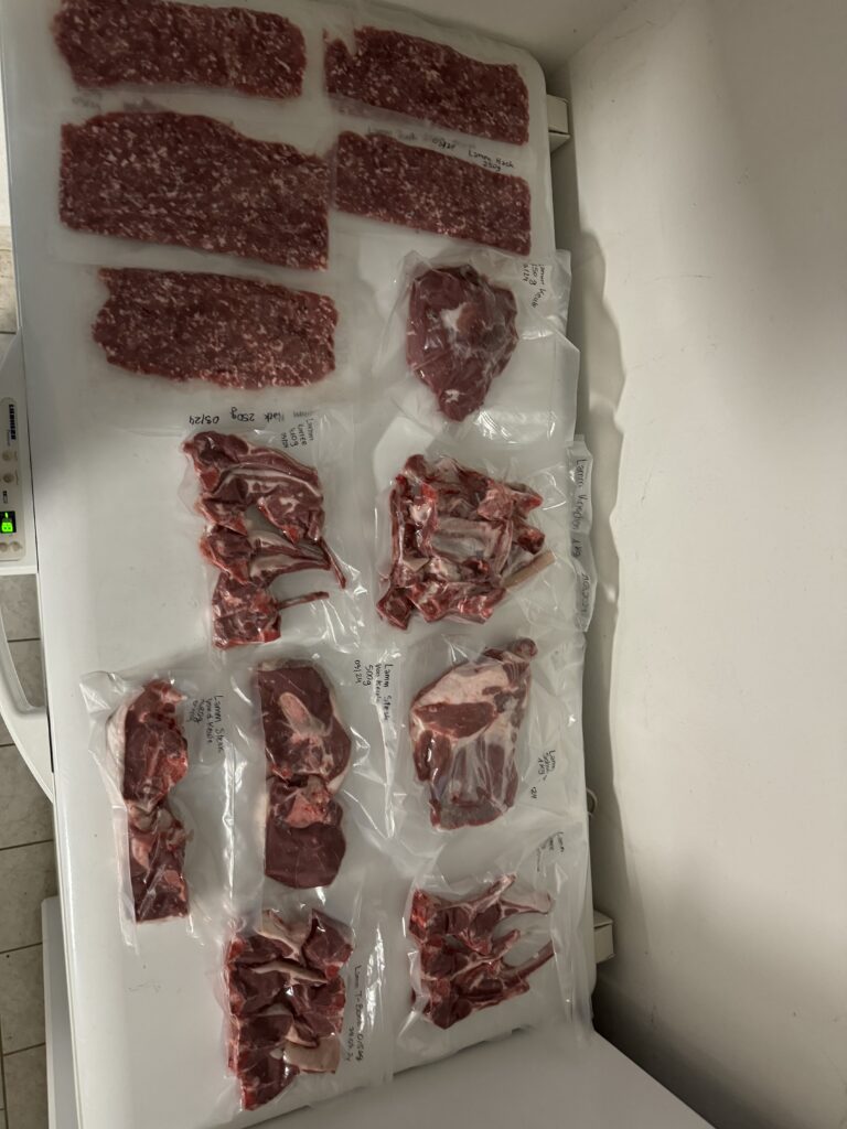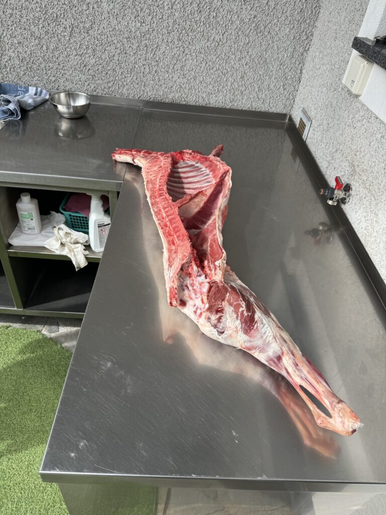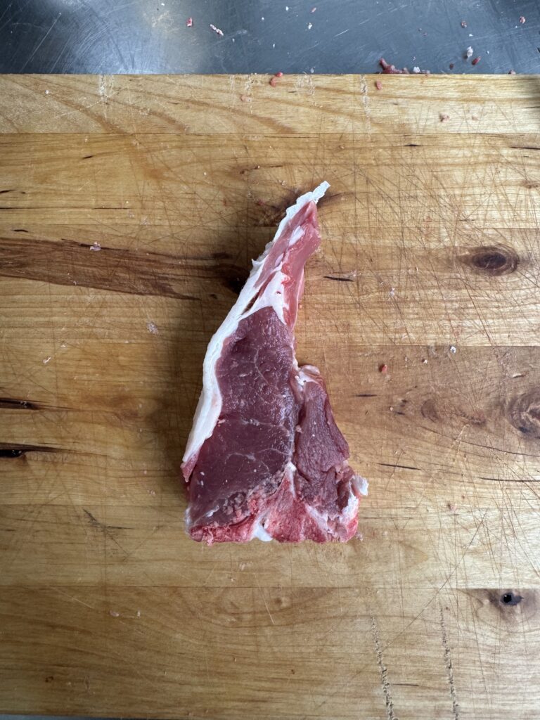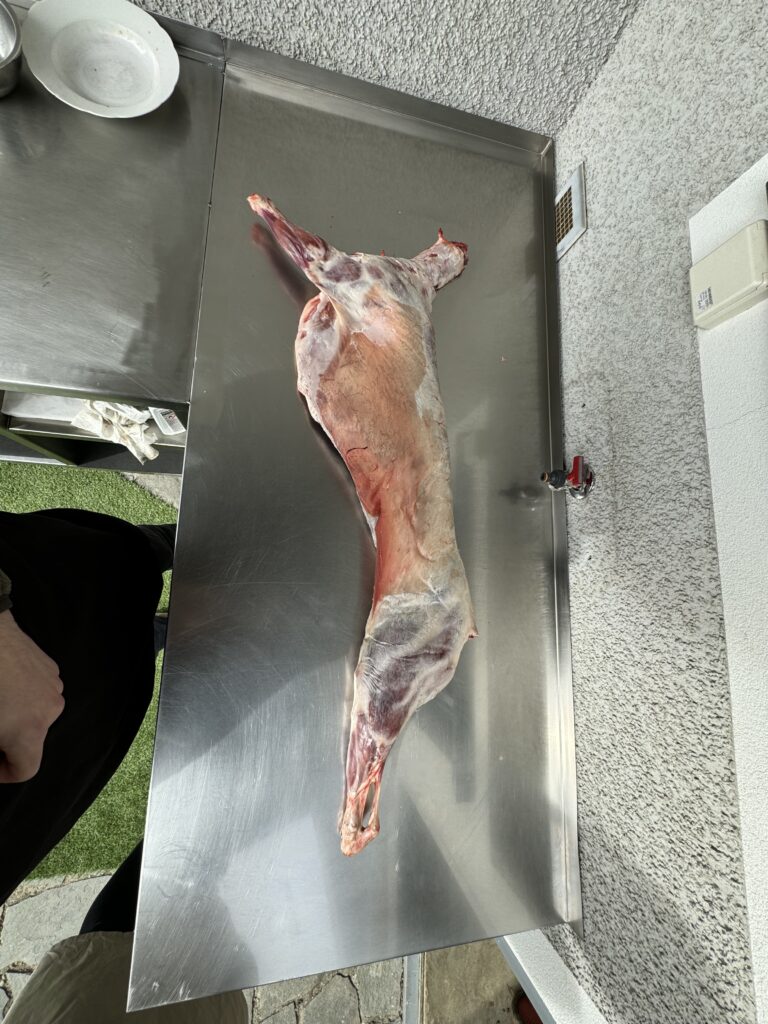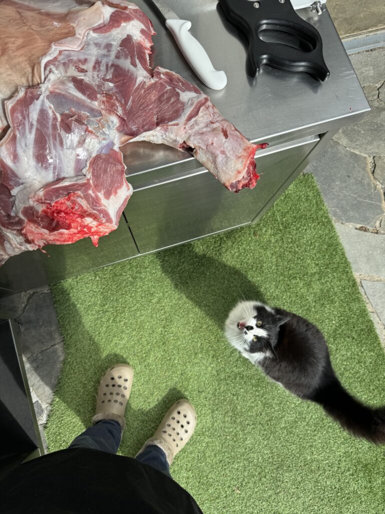 Um ein besseres Gefühl für das Tier und die Teile zu bekommen habe ich beschlossen diese selbst fachgerecht zu zerlegen. Bei den Teilstücken habe ich mich gespielt, so sieht man zB am Foto ein T-Bone oder Porterhouse Äquivalent vom Lamm. Der Kater spekulierte natürlich auf eventuelle Leckerbissen. Alles kleine Fleisch wurde natürlich faschiert und nichts verschwendet.