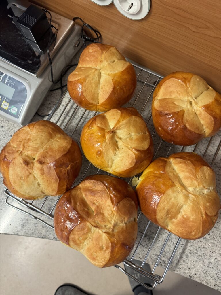 In 200°C vorgeheizten Backofen einschießen und bei 180°C 20min ausbacken (oder bis die Kerntemperatur 93°C beträgt)