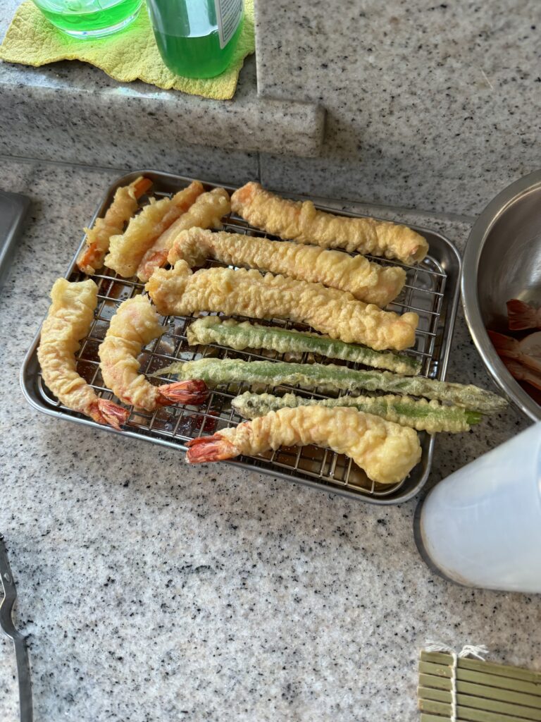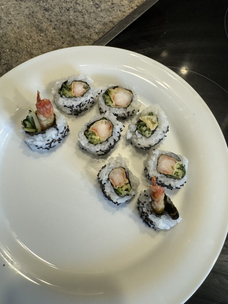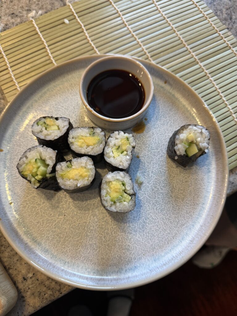 Mit Anweisungen vom Videokochkurs zu Sushi von Eduard Dimant (Mochi Wien) ausgerüstet, wagte ich eines Abends den Selbstversuch. Neben der selbstgemachten Teriyaki Sauce kochte ich Lachs, Garnelen und Spargel in Tempuramantel. Beim Rollen brauch ich eindeutig noch etwas mehr Übung, gerade die Maki sind schon schwierig.