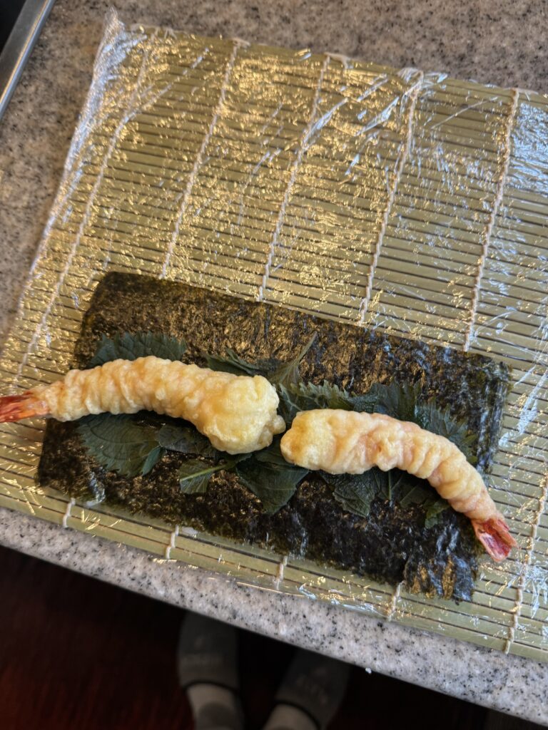 Inside-Out Roll mit Shisho, Garnelentempura, Gurke