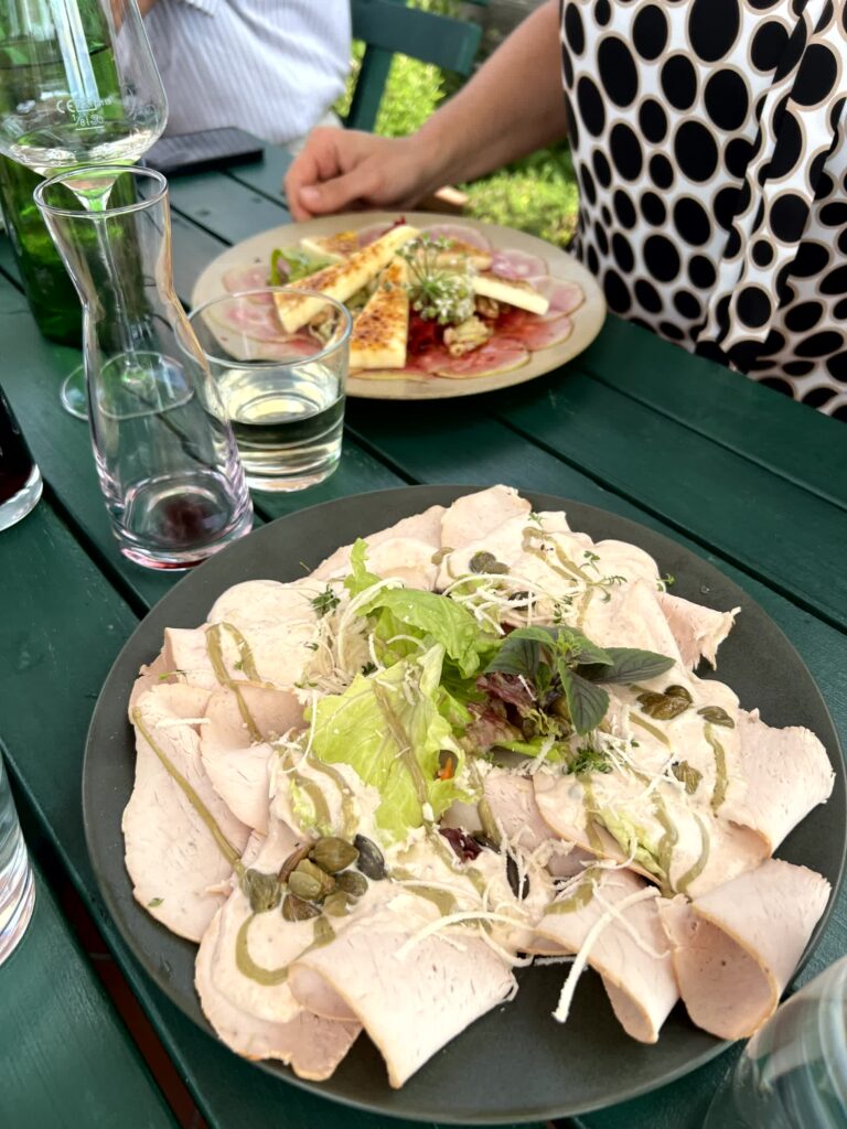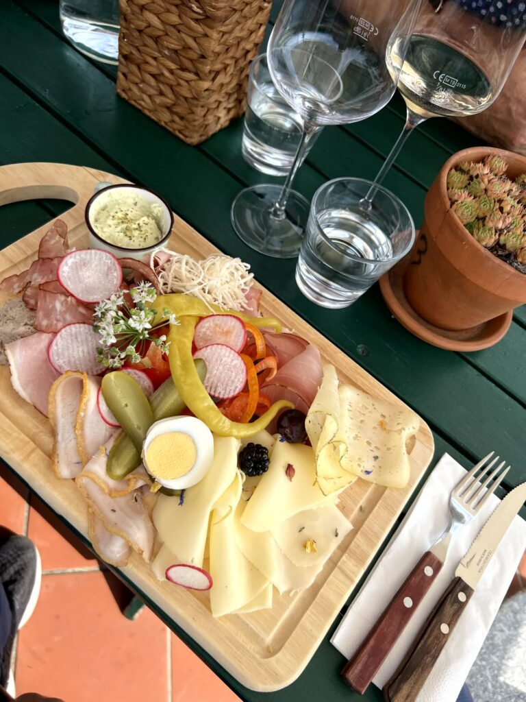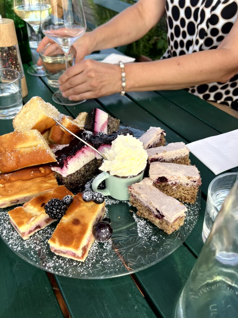 Spontaner Buschenschank Besuch im Gerngross, die klassische Brettljause sehr schön angerichtet und super gut. Auch das steirische Vitello Tonnato mit Schweinefleisch eine willkommene Abwechslung. Die Dessertvariation durfte dann auch nicht fehlen! Begleitet wurde das vom eigenen Wein, der einem das geschmacklich meist negative Bio-Label überdenken lässt. Ich war positiv überrascht, vorallem der Amphoren Wein war ein Traum (Name: Ungezwungen?). Die schöne Aussicht muss ich glaub ich nicht erwähnen 😉