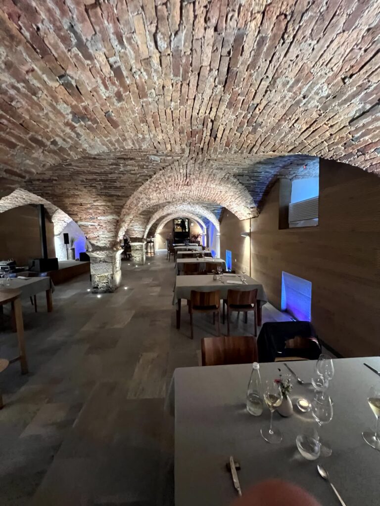 Das slowenische Weingut vom Stift Admont Dveri Pax bietet nicht nur Wein sondern auch kulinarische Eindrücke. Der Gewölbekeller der als Speisesaal fungiert ist natürlich die ideale Location. Fixe Karte gibt es keine, man wird gefragt ob man Allergien hat und sonst bekommt man es einfach.