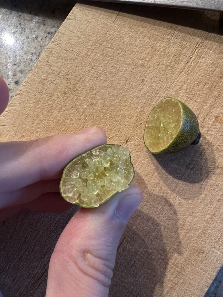 Fingerlimette oder Limettenkaviar aus Spanien (anstatt wie heimisch aus Australien) zu bekommen ist schon sehr cool. Auch die normal typisch japanische Yuzu bekommt man hier (später ist sie auch typisch gelb!).
