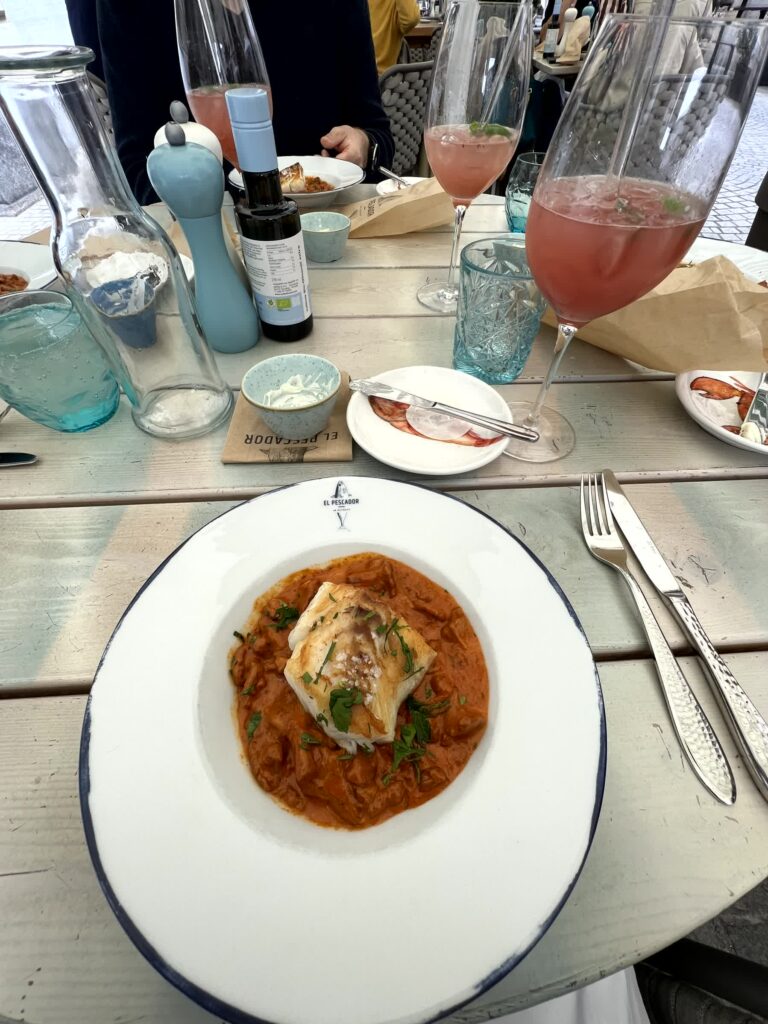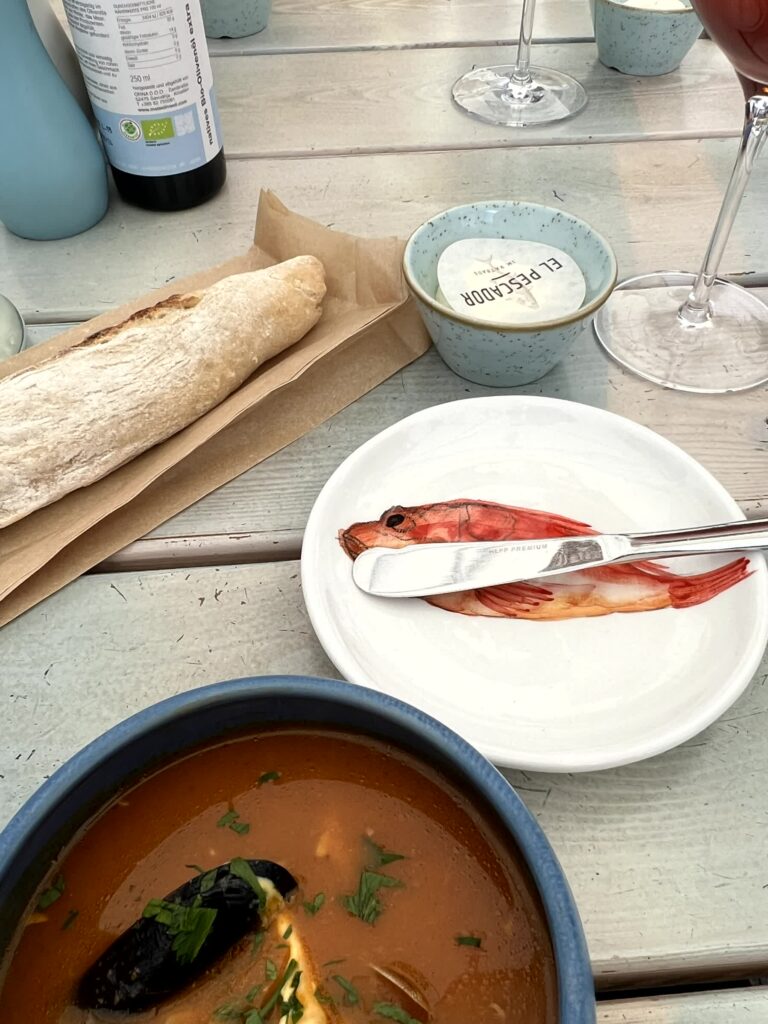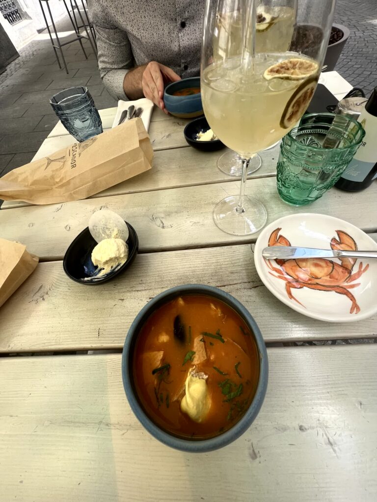 Kleiner Ausflug in die Landhausgasse. Es gab Brot mit Butter, die kleine Fischsuppe, Goldbrasse auf cremiger Polenta und einen Birnenkuchen. Sehr solides Mittagessen, kann ich nur empfehlen.