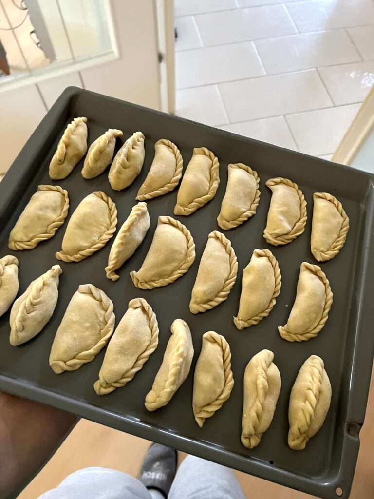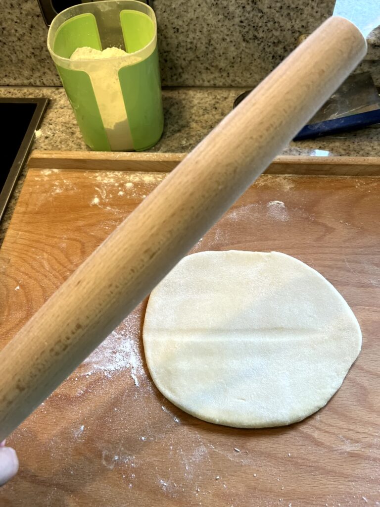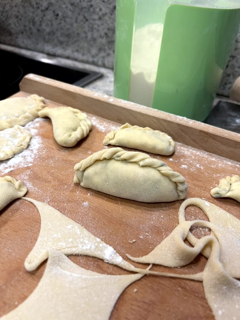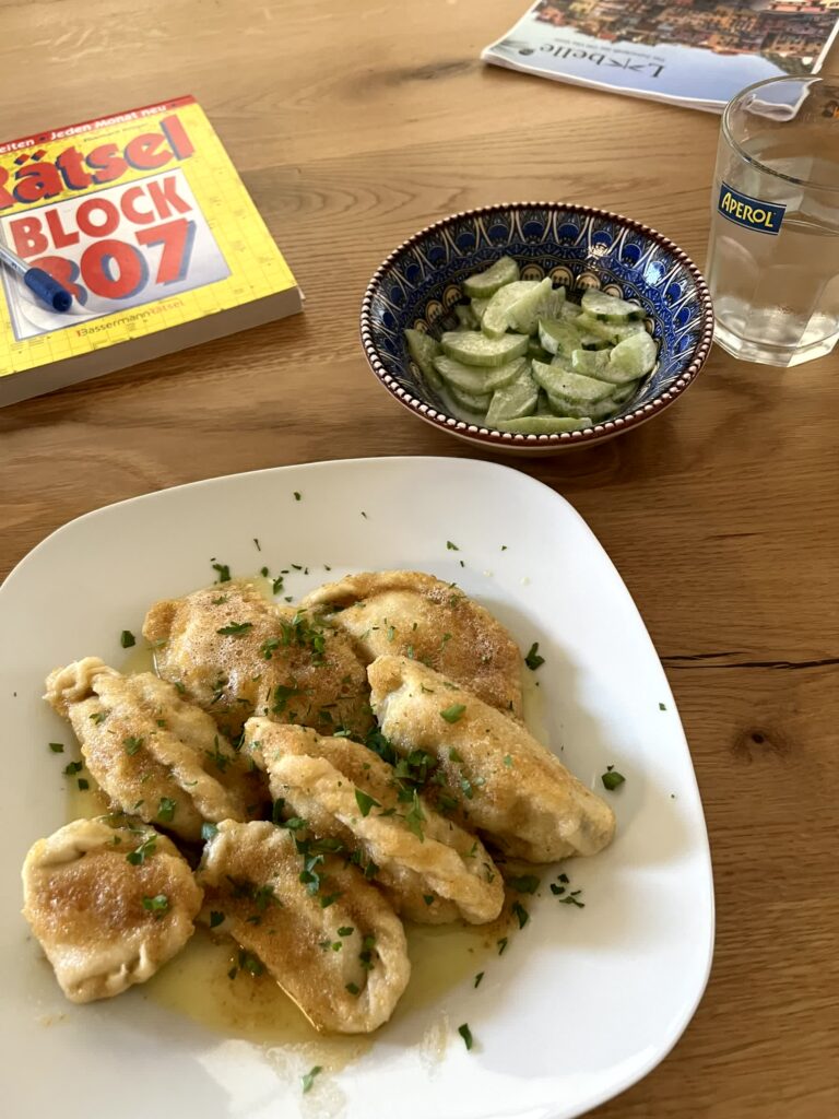 Vormittags in der „Teigtaschenfabrik“. Gemacht wurden sie mit weichem Nudelteig und einerseits einen reinen Topfenfülle und die anderen mit Topfen-Erdäpfel Fülle. Zweiteres hat einen besseren Biss und behielt die Form beim Kochen besser. Geschmeckt haben beide!