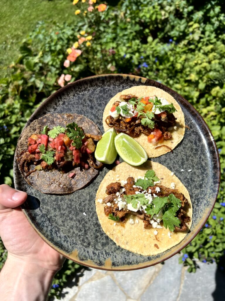 Inspiriert von den Tacos in Wien gab es selbst Tacos in drei Varianten: Schweineschopf mariniert mit Achiote Paste, dazu gegrillte Ananas, confierte Rinderbrust und gekochte Rinderbrust mit reichlich Chili. Dazu Guacamole, Pico de Gallo, Queso Fresco, eingelegte Zwiebel, Koriander und natürlich Limettenscheiben.
